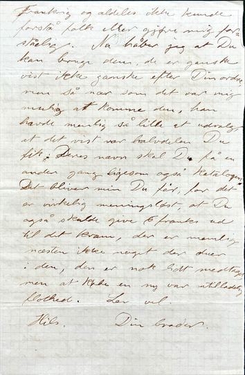 Frankrig og aldeles ikke kunde forstå folk eller gjøre mig forståelig. Nu håber jeg at Du kan bruge dem, de er ganske vist ikke ganske efter Din ordre, men så nær som det var mig mulig at komme den, han havde nemlig så lille et udvalg, at det vist var halvdelen Du fik. Deres navn skal Du få en anden gang ligesom også katalogen. Det bliver min Du får, for det er virkelig meningløst, at Du også skulde give 6 franks ud til det kram, der er nemlig næsten ikke noget der duer i den, den er nok lidt medtaget, men at købe en ny var utilladelig flothed. Lev vel. Hils.