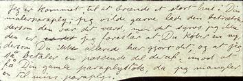 Jeg er kommet til at brænde et stort hul i Din malerparaply; jeg vilde gærne lade den betrække, dersom den var det værd, men det synes jeg ikke den er, jeg foreslår at Du køber en ny, dersom Du ikke allerede har gjort det, og at jeg så betaler en passende del deraf, imod at få Din gamle paraplystok, da jeg mangler en til min paraply.