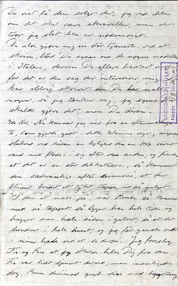 4de Nov. Nu kommer jeg ned fra en eftermiddagste som gjorde godt i det klamme vejr, ungerne slubrer ved sådan en lejlighed den ene kop varmt vand med fløde i i sig efter den anden, og finder at det er en stor delikatesse, så kommer den sædvanlige aften ceremoni, at der bliver bredet et tykt tæppe ud på gulvet til den at mase på når Konse så kommer med på tæppet så ligger han hele tiden og hugger sine hæle sådan i gulvet, så at det dundrer i hele huset, og jeg får ganske ondt i mine hæle af at se derpå. Jeg foreslog Fia og Kim at jeg skulde hilse Dig fra dem, Fia var lidt sjenert derved, men indvilligede dog, Kim derimod greb ideen med begejstring. Tante tænker, som Du måske kan tænke, på at skrive til Dig. Jeg har lavet en lille radering fra fyrskoven, det er kun sådan en lille [?], og der må gjøres mere ved den når jeg kommer hjem, hvor jeg har bedre aparater, det er det meste der kom ud af de store planer om at radere efter naturen i sommer, jeg tegnede for resten en større plade næsten færdig, det var kvarnen inde fra gården, men den kasserede jeg uden at se den. Mit lille billede nede fra kvarnen, som jeg malede på ifjor, og vilde gjort færdig i år, har jeg kun rørt lidt ved, derimod malte jeg videre på det fra i forfjor, og forandrede det til eftermiddag, meget bedre, det var sjældent den slags vejr, så jeg blev ikke færdig, men det jeg fik gjort, blev slet ikke tovligt, det var nu så heldigt, at der iår lå en mængde tømmer, og det gjør god virkning på det. Onkel Kristian skriver at han ikke kan begribe, hvor nogle billeder Du har sendt bliver af, i næste uge der begynder med den 11te, bliver det da nok til noget med min hjemrejse tænker jeg. Hils Viggo og lev vel, jeg kommer skam ikke til Jer til vinter, for jeg har ikke i sinde at overtale Ludvig dertil, og jeg tænker heller ikke han mig. Din broder
