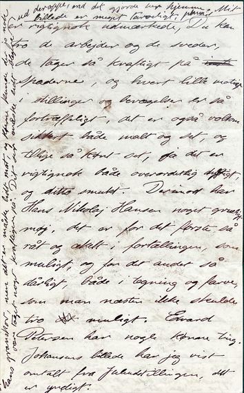 er rigtignok udmærkede, Du kan tro de arbejder og de sveder, de tager så kraftigt på ? spaderne, og hvert lille motiv i stillinger og bevægelser er så fortræffeligt, det er også volsom sikkert både malt og set, og tillige så kønt set, ja det er rigtignok overordetlig dejlgt, og ditto smukt. Derimod har Hans Nikolaj Hansen noget grueligt møg, det er for det første så råt og ækelt i fortællingen, som muligt, og for det andet så dårligt, både i tegning og farve, som man næsten ikke skulde tro det muligt. Edvard Petersen har nogle kønne ting. Johansens billede har jeg vist omtalt fra juleudstillingen, det er yndigt.