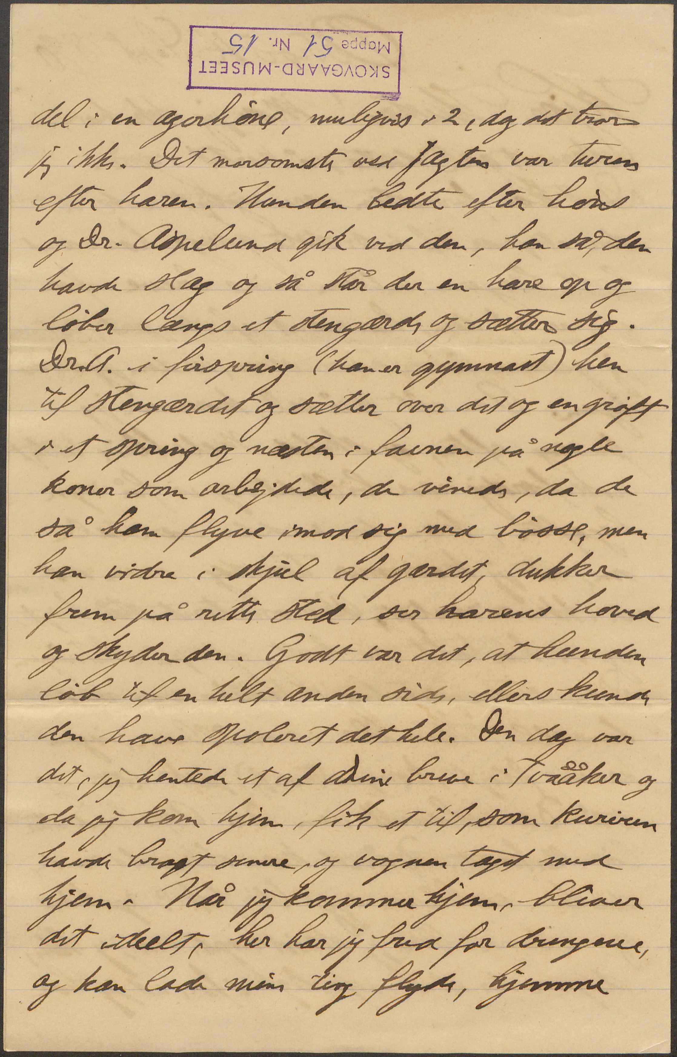 del i en agerhøne, muligvis i 2, dog det tror jeg ikke. Det morsomste ved jagten var turen efter haren. Hunden ledte efter høns og Dr. Aspelund gik ved den, han så, den havde slag og så står der en hare op og løber langs et stengærde og sætter sig. Dr. A. i firspring (han er gymnast) hen til stengærdet og sætter over det og en grøft i et spring og næsten i favnen på nogle koner som arbejdede, de [?vineds], da de så ham flyve imod sig med bøsse, men han vidre i skjul af gærdet, dukker frem på rette sted, ser harens hoved og skyder den. Godt var det, at hunden løb til en helt anden side, ellers kunde den have spoleret det hele. Den dag var det, jeg hentede et af dine breve i Tvååker og da jeg kom hjem, fik et til, som kuriren havde bragt senere, og vognen taget med hjem. Når jeg kommer hjem, bliver det ideelt, her har jeg fred for drengene, og kan lade mine ting flyde, hjemme