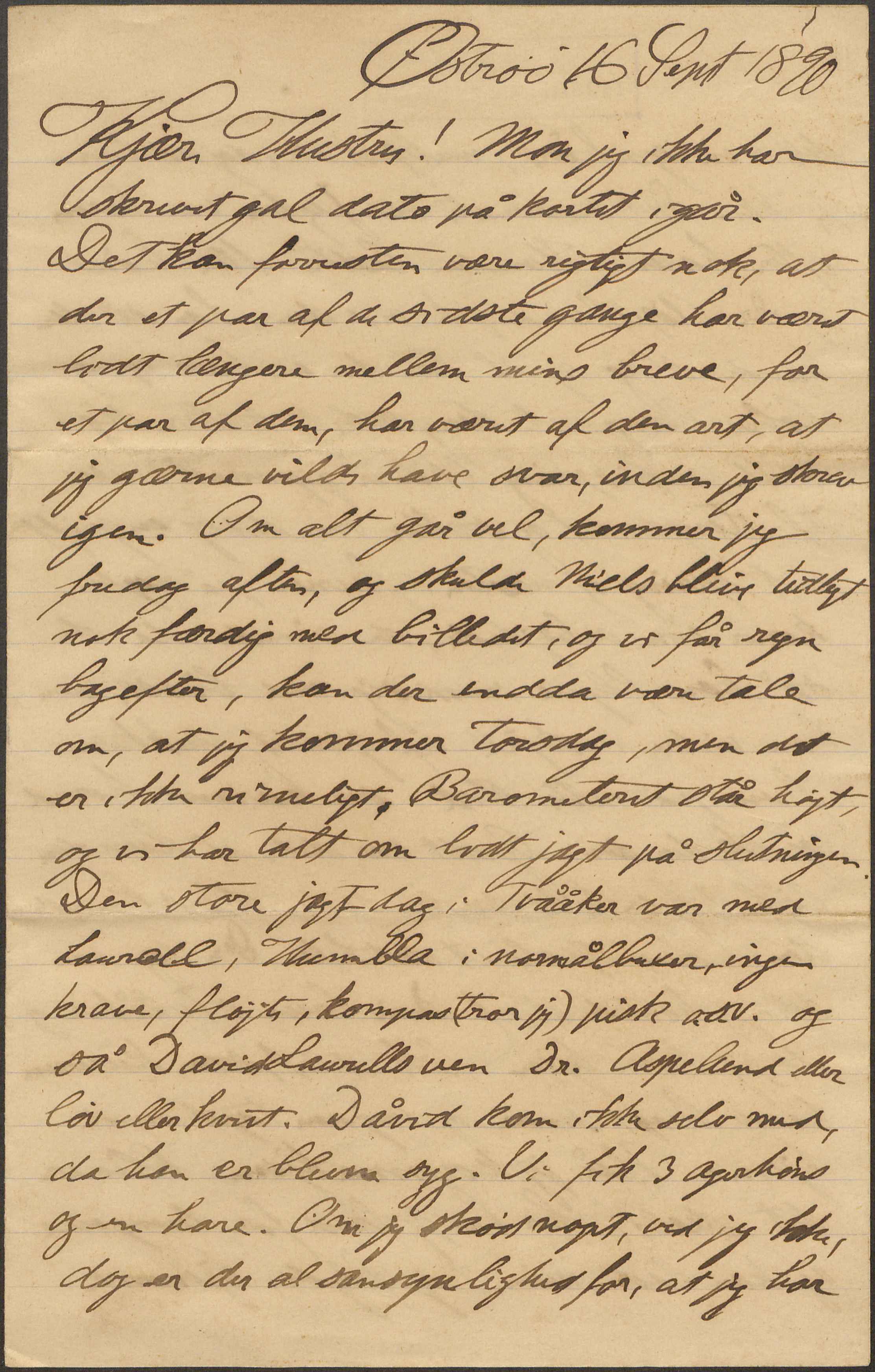 Kjære Hustru! Mon jeg ikke har skrevet gal dato på kortet i går. Det kan for resten være rigtigt nok, at der et par af de sidste gange har været lidt længere mellem mine breve, for et par af dem, har været af den art, at jeg gærne vilde have svar, inden jeg skrev igen. Om alt går vel, kommer jeg fredag aften, og skulde Niels blive tidligt nok færdig med billedet, og vi får regn bagefter, kan der endda være tale om, at vi kommer Torsdag, men det er ikke rimeligt. Barometeret står højt, og vi har talt om lidt jagt på slutningen. Den store jagtdag i Tvååker var med Laurell, Humble i normålbuxer, ingen krave, fløjte, kompas (tror jeg) pisk osv. og så David Laurells ven Dr. Aspelund eller løv eller kvist. Dåvid kom ikke selv med, da han er bleven syg. Vi fik 3 agerhøns og en hare. Om jeg skød noget, ved jeg ikke, dog er der al sansynlighed for, at jeg har