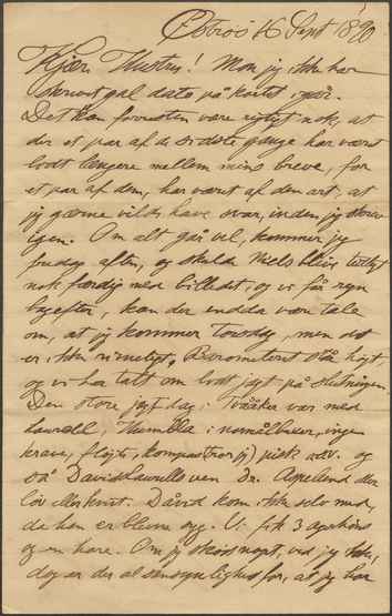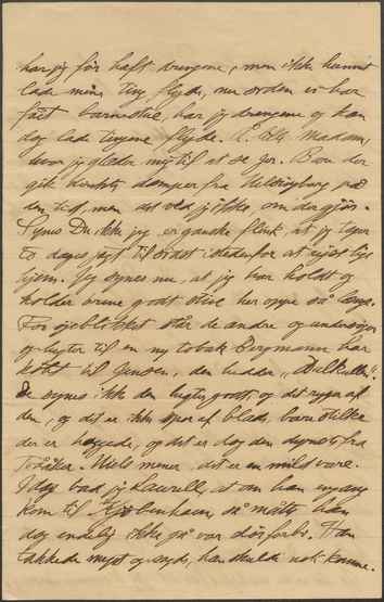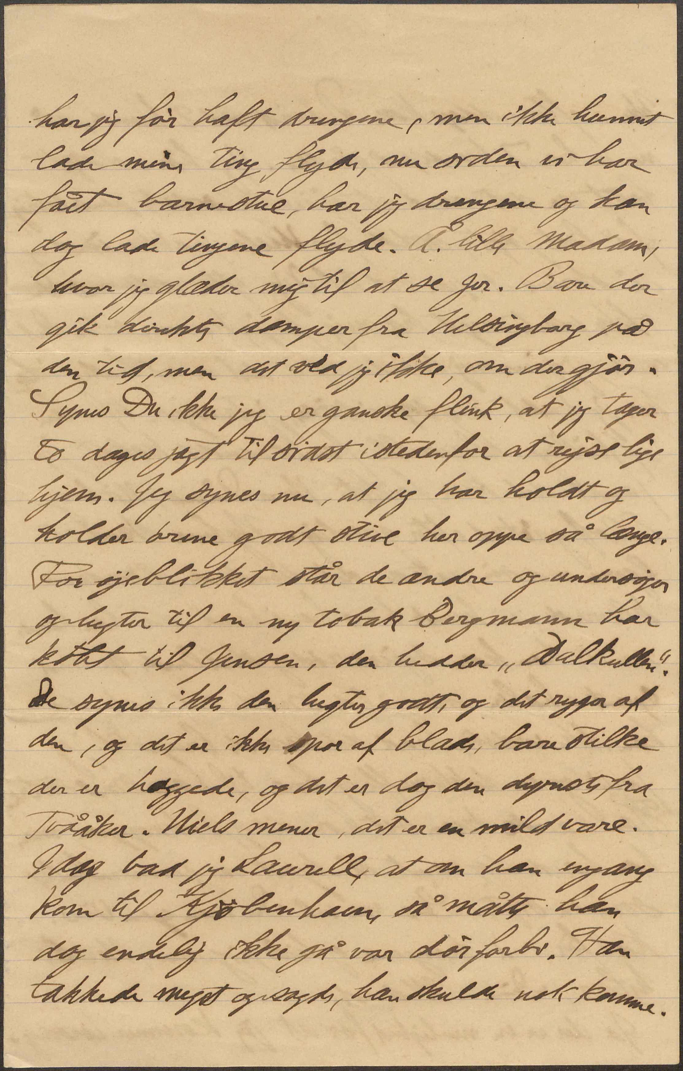 har jeg før haft drengene, men ikke kunnet lade mine ting flyde, nu siden vi har fået barnestue, har jeg drengene og kan dog lade tingene flyde. Å, lille Madam, hvor jeg glæder mig til at se Jer. Bare der gik direkte damper fra Helsingborg på den tid, men det ved jeg ikke, om der gjør. Synes Du ikke jeg er ganske flink, at jeg tager to dages jagt til sidst istedenfor at rejse lige hjem. Jeg synes nu, at jeg har holdt og holder ørene godt stive her oppe så længe. For øjeblikket står de andre og undersøger og lugter til en ny tobak Bergmann har købt til Jensen, den hedder ”Dalkullen”. De synes ikke den lugter godt, og det ryger af den, og det er ikke spor af blade, bare stilke der er haggede, og det er dog den dyreste fra Tvååker. Niels mener, det er en mild vare. I dag bad jeg Laurell, at om han engang kom til Kjøbenhavn, så måtte han dog endelig ikke gå vor dør forbi. Han takkede meget og sagde, han skulde nok komme.