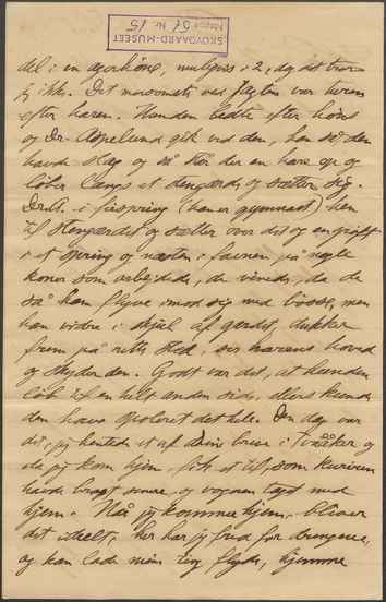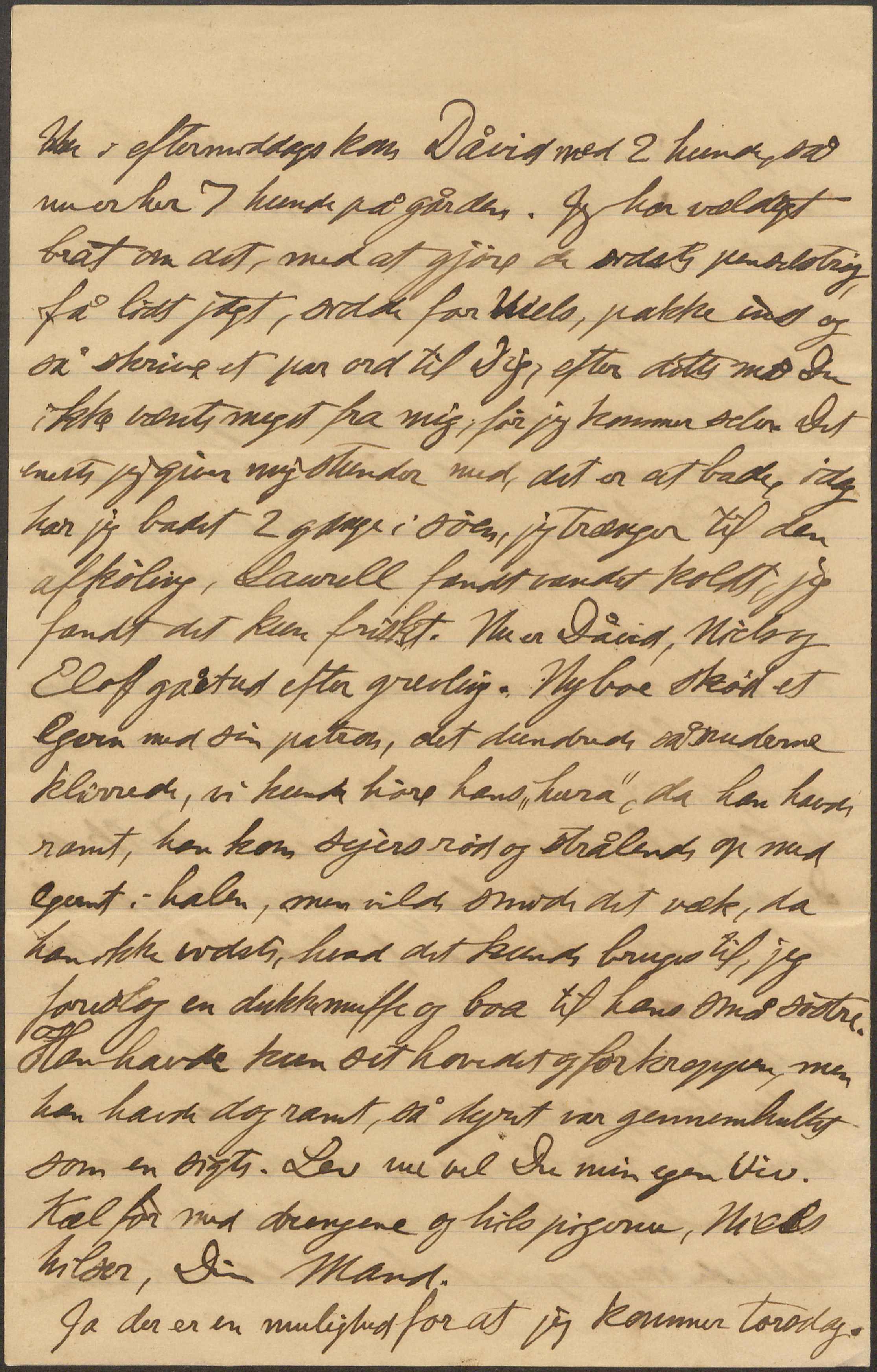 Her i eftermiddags kom Dåvid med 2 hunde, så nu er her 7 hunde på gården. Jeg har vældigt [?] om det, med at gjøre de sidste penselstrøg få lidt jagt, sidde for Niels, pakke ind og så skrive et par ord til Dig, efter dette må Du ikke vænte meget fra mig, før jeg kommer selv. Det eneste jeg giver mig stunder med, det er at bade, i dag har jeg badet 2 gange i søen, jeg trænger til den afkøling, Laurell fandt vandet koldt, jeg fandt det kun friskt. Nu er Dåvid, Niels og Elof gået ud efter grevling. Nyboe skød et egern med sin patron, det dundrede så ruderne klirrede, vi kunde høre hans ”hura” da han havde ramt, han kom sejersrød og strålende op med egernet i halen, men vilde smide det væk, da han ikke vidste, hvad det kunde bruges til, jeg foreslog en dukkemuffe og boa til hans små søstre. Han havde kun set hovedet og forkroppen, men han havde dog ramt, så dyret var gennemhullet som en sigte. Lev nu vel Du min egen Viv. Kæl med drengene og hils pigerne, Niels hilser, Din Mand.