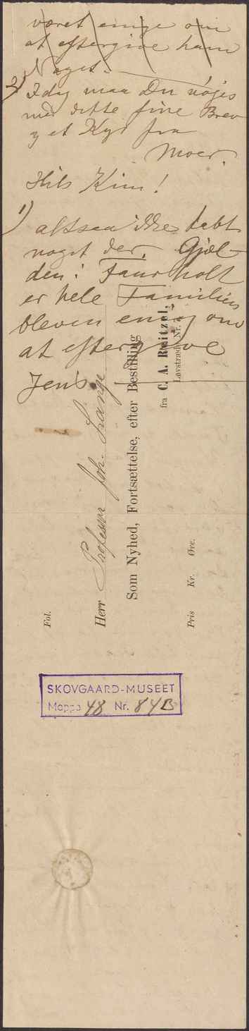 Maaske dette Brev helst skulde sendes til Rom, da det lader til at I som snarest reise derhen, men da I intet bestemt skriver derom, maa det jo til Pompei. Jeg skynder mig at skrive for at give Dig den Besked, jeg kan, min lille elskede Pige! Jeg har ligesaa lidt Tvivl som Izzo om at Du du vil blive Moder, det bedste, der er til paa Jorden. Det afgjørende Tegn viser sig jo først i Midten af den 5te Maaned, naar man mærker Liv og det (er) |kan| endda de første Gange være næsten umærkeligt og med lange Mellemrum. Jeg har hørt om andre, som have det maanedlige hele Tiden* |endog| stærkere end sædvanlig, - saa maa de naturligvis ligge, i det mindste af og til, - men af Erfaring kjender jeg det slet ikke. Det er dejligt at Du er rask, kan taale, hvad Du spiser; det styrker baade Moder og Barn. De smaa pludselige Opkastninger er netop et tydeligt Tegn; mindst behageligt er det naar de komme ved Bordet* og man [?] sig for en hel Forsamling. – Det er rigt Ret, Kim! at Du er omhyggelig, men Du maa ikke overdrive det; jeg er vis paa at Agnete vil være fornuftig; hun kan godt selv tage sine Sager op og endogsaa pille et Par Snegle-