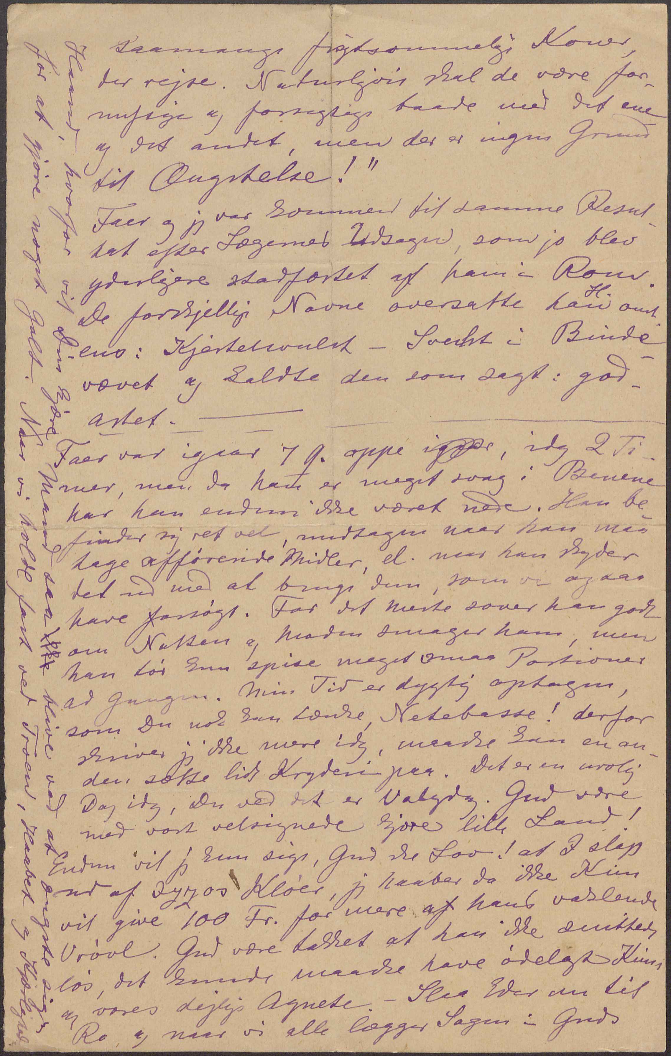 Faer var igaar 7 Q. oppe igaar, idag 2 Timer, men da han er meget svag i Benene har han endnu ikke været nede. Han befinder sig ret vel, undtagen naar han maa tage afførende Midler, el. naar han skyder det ud med at bruge dem, som vi ogsaa have forsøgt. For det meste sover han godt om Natten og Maden smager ham, men han tør kun spise meget smaa Portioner ad Gangen. Min Tid er dygtig optagen, som Du nok kan tænke, Netebasse! derfor skriver jeg ikke mere idag, maaske kan en anden sætte lidt Kryderi paa. Det er en urolig Dag i dag, Du ved det er Valgdag. Gud være med vort velsignede kjære lille Land! Endnu vil jeg kun sige, Gud ske Lov! at I slap ud af Iyzos Kløer, jeg haaber da ikke Kim vil give 100 Fr. for mere af hans vaklende Vrøvl. Gud være takket at han ikke snittede løs, det kunde maaske have ødelagt Kims og vores dejlige Agnete. – Slaa Eder nu til Ro og naar vi alle lægger Sagen i Guds