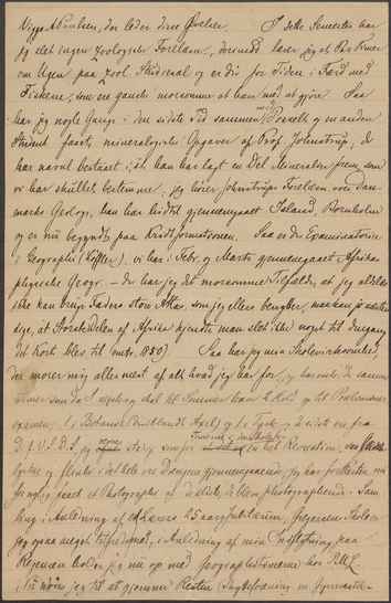 I dette Semester har jeg slet ingen zoologiske Forelæsn., derimod læser jeg et Par Timer om Ugen paa zool. Studiesal og er dér for Tiden i Færd med Fiskene, som ere ganske morsomme at have med at gjøre. Saa har jeg nogle Gange i den sidste Tid sammen |med| Posselt og en anden Student faaet mineralogiske Opgaver af Prof. Johnstrup; de har navnl. bestaaet i, at han har lagt en Del Mineralier frem, som vi har skullet bestemme; jeg hører Johnstrups Forelæsn. over Danmarks Geologi, han har hidtil gjennemgået Island, Bornholm og er nu begyndt paa Kridtformationen. Saa er der Examinatorier i Geographi (Løffler), vi har i Febr. og Marts gjennemgaaet Afrikas physiske Geogr. – der har jeg det morsomme Tilfælde, at jeg aldeles ikke kan bruge Faders store Atlas, som jeg ellers benytter, man kan jo næsten sige, at Størstedelen af Afrika kendte man slet ikke noget til dengang det Kort blev til (omtr. 1850).