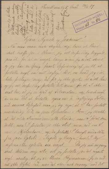 Nu maa man nok skynde sig, hvis et Brev skal træffe jer i Rom, jeg vil derfor idag begynde paa ét, for det er meget længe siden, jeg sidst skrev, og jeg har en Gang faaet Opfordring af jer til at fortælle noget, om mit daglige Liv, om hvad jeg i det hele foretager mig; det fik jeg ikke gjort i det sidste Brev, og jeg vil derfor idag fortælle lidt derom, for at I ikke skal tro, at jeg er kjed af Tilværelsen, nej, tværtimod, der er en Del at fortælle ogsaa om de dagligdags Folder; ved samme Lejlighed maa jeg dog sige, at I har fortalt mærkværdig lidt om jeres Oplevelser i Rom; jeg tænkte, at det vilde strømme over alle Bredder, naar I først kom dertil, men I fortæller jo ikke stort mere, end om I var i Kjøbenhavn, nej, da fortalte I langt anderledes fra jeres Ophold i Napoli og Omegn, hvor I dog sagtens ikke oplevede saa meget.