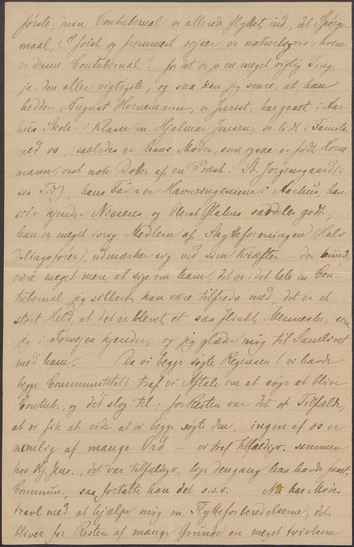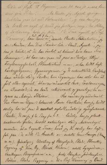 Nu tænker jeg, Agnete spørger: hvorledes gaar det med Botanikken?, og saa kan jeg da berette om noget af hvad jeg foretager mig i den Retning; af Forelæsning hører jeg kun 1½ Time ugentl. af Prof. Warming; |Fred. Kl. 7. ?| hans Emne er ”danske Planters Naturhistorie”, jeg ser i Aanden, hvor Dine Tænder løbe i Vand, Agnete!; jeg kan jo huske, at du har ønsket at kunne høre hans Forelæsninger; det han især gaar ind paa er Biologi, tillige Forgreningsforhold, Blomsterstand m.m.; vi har hidtil haft Karkryptogamer, Gymnospermer og de enkimbladede Vandplanter, han uddeler stadig Tavler, hvis Tegninger han selv har udført eller copieret, det er en udmærket Skik; Forelæsningerne ere udmærkede, de ere baade interessante og gavnlige, der er ogsaa en Mængde Tilhørere.