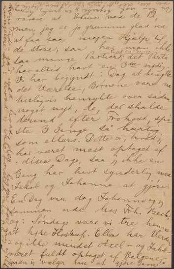 rarere at blive ved de 12, men jeg er jo grumme glad ved at faa saa megen Hjælp til de store, saa har man ikke saa mange Partier |på en Gang|; det Parti har altid havt en 3die nødig. Vi har begyndt i Dag at benytte det Værelse, børnene vare naturligvis henrykte over sådan noget nyt, de, der skulde derind efter Frokost, spiste 3 Gange så hurtig som ellers. Derre er, hvad jeg har været mest optaget af i disse Dage, saa jeg ikke en Gang har havt synderlig med Jakob og Johanne at gjøre. En Dag var dog Johanne og jeg sammen ude hos Frk. Bech, og i Søndags vare vi tre henne at høre Hostrup. Ellers har Verden og ikke mindst Axel - og Jakob – været fuldt optaget af Valgene, men jeg vælger nu at gjøre Gavn*