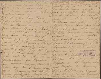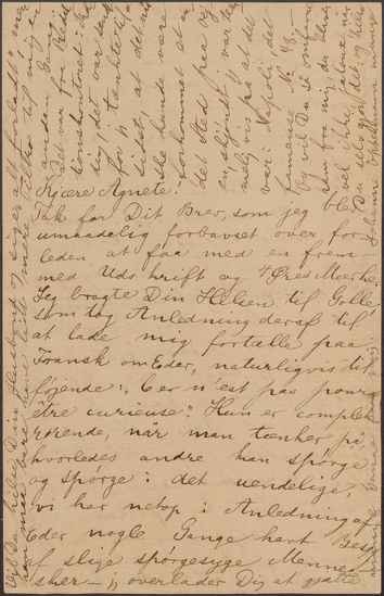 Tak for Dit Brev, som jeg blev umaadelig forbavset over forleden at faa med en fremmed Udskrift og 4 Øres Mærke. Jeg bragte Din Hilsen til Golle, som tog Anledning deraf til at lade mig fortælle paa Fransk om Eder, naturligvis tilføjende: ”Cet n’est pas pour être curieuse”. Hun er complet rørende, når man tænker på, hvorledes andre kan spørge og spørge i det uendelige, vi har netop i Anledning af Eder nogle Gange havt Besøg af slige spørgesyge Mennesker – jeg overlader Dig at gjætte