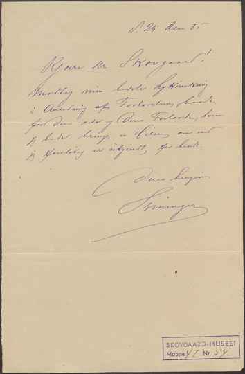 Modtage min bedste Lykønskning i anledning af Forlovelsen, baade til Dem selv og Deres Forlovede, hvem jeg beder bringe en Hilsen om end jeg foreløbig er ukendt med hende