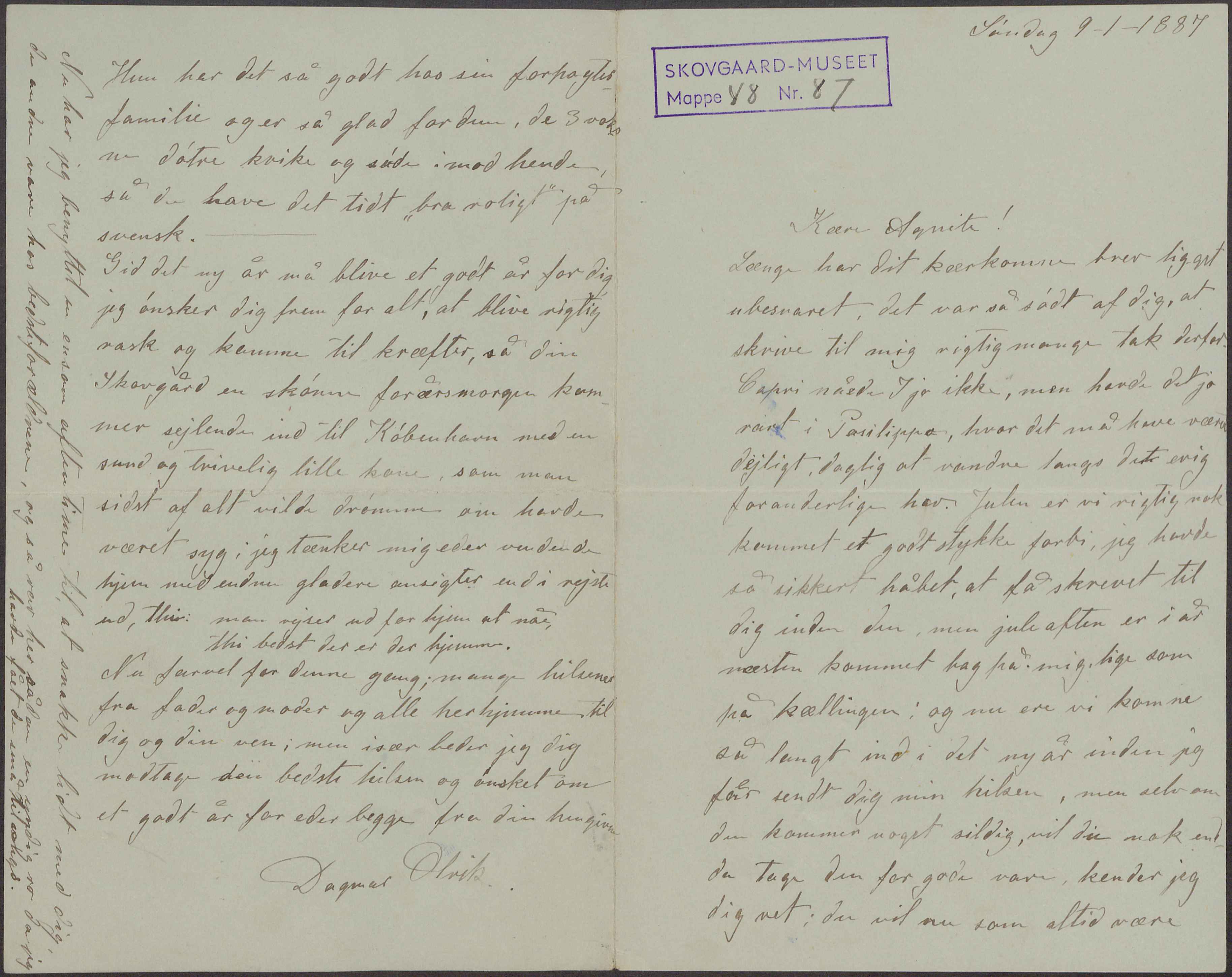Gid det ny år må blive et godt år for dig, jeg ønsker dig frem for alt, at blive rigtig rask og komme til kræfter, så din Skovgård en skønne forårsmorgen kommer sejlende ind til København med en sund og trivelig lille kone, som man sidst af alt vilde drømme om havde været syg ; jeg tænker mig eder vendende hjem med endnu gladere ansigter end i rejste ud, thi: