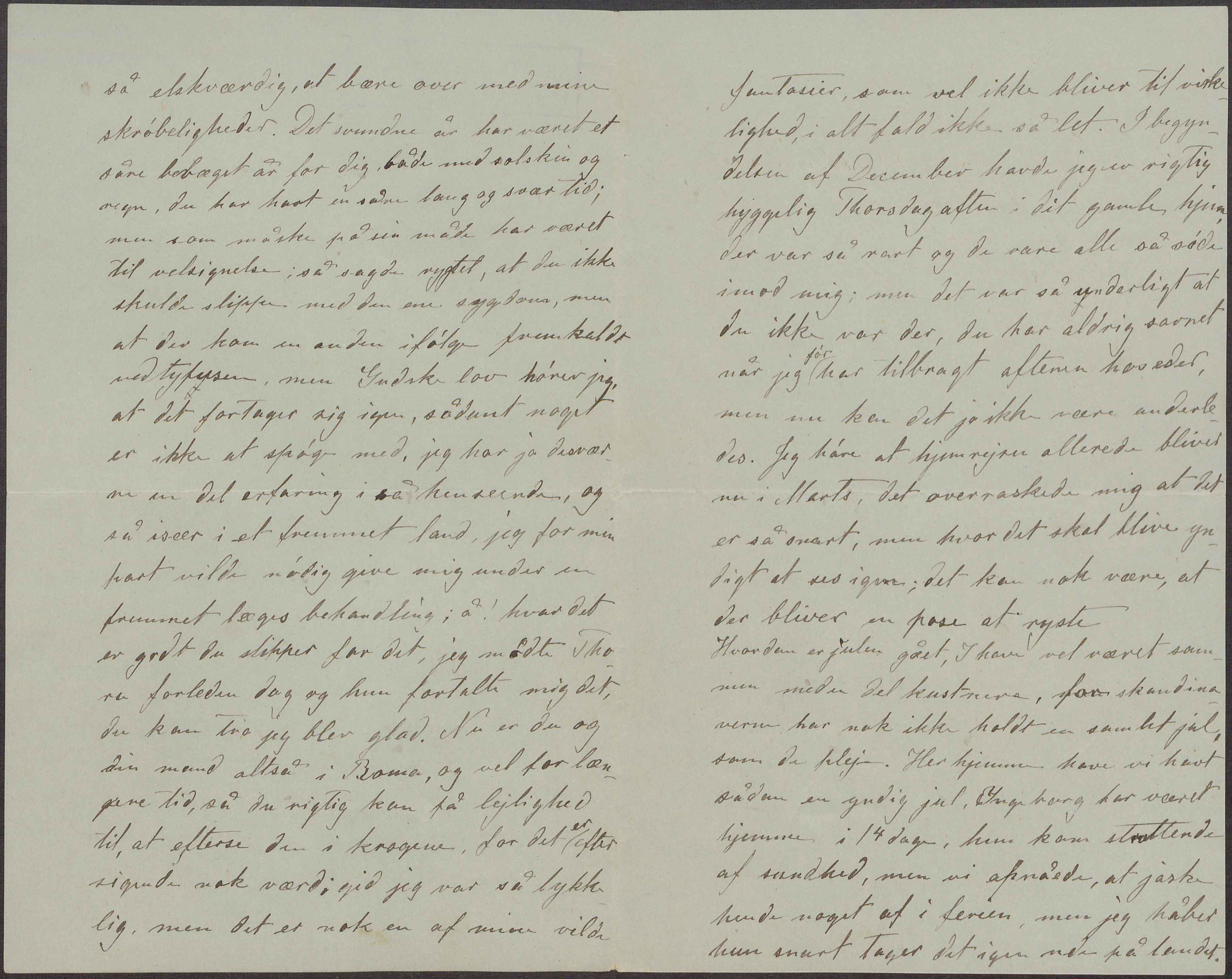 så elskværdig, at bære over med mine skrøbeligheder. Det svundne år har været et såre bevæget år for dig, både med solskin og regn, du har havt en såre lang og svær tid; men som måske på sin måde har været til velsignelse; så sagde rygtet, at du ikke skulde slippe med den ene sygdom, men at der kom en anden ifølge fremkaldt ved tyfusen, men Gudske lov hører jeg, at det fortager sig igen, sådant noget er ikke at spøge med, jeg har jo desværre en del erfaring i så henseende, og så især i et fremmet land, jeg for min part vilde nødig give mig under en fremmet læges behandling; å! hvor det er godt du slipper for det, jeg mødte Thora forleden dag og hun fortalte mig det, du kan tro jeg blev glad. Nu er du og din mand altså i Roma, og vel for længere tid, så du rigtig kan få lejlighed til, at efterse den i krogene, for det |er| efter sigende nok værd; gid jeg var så lykkelig, men det er nok en af mine vilde