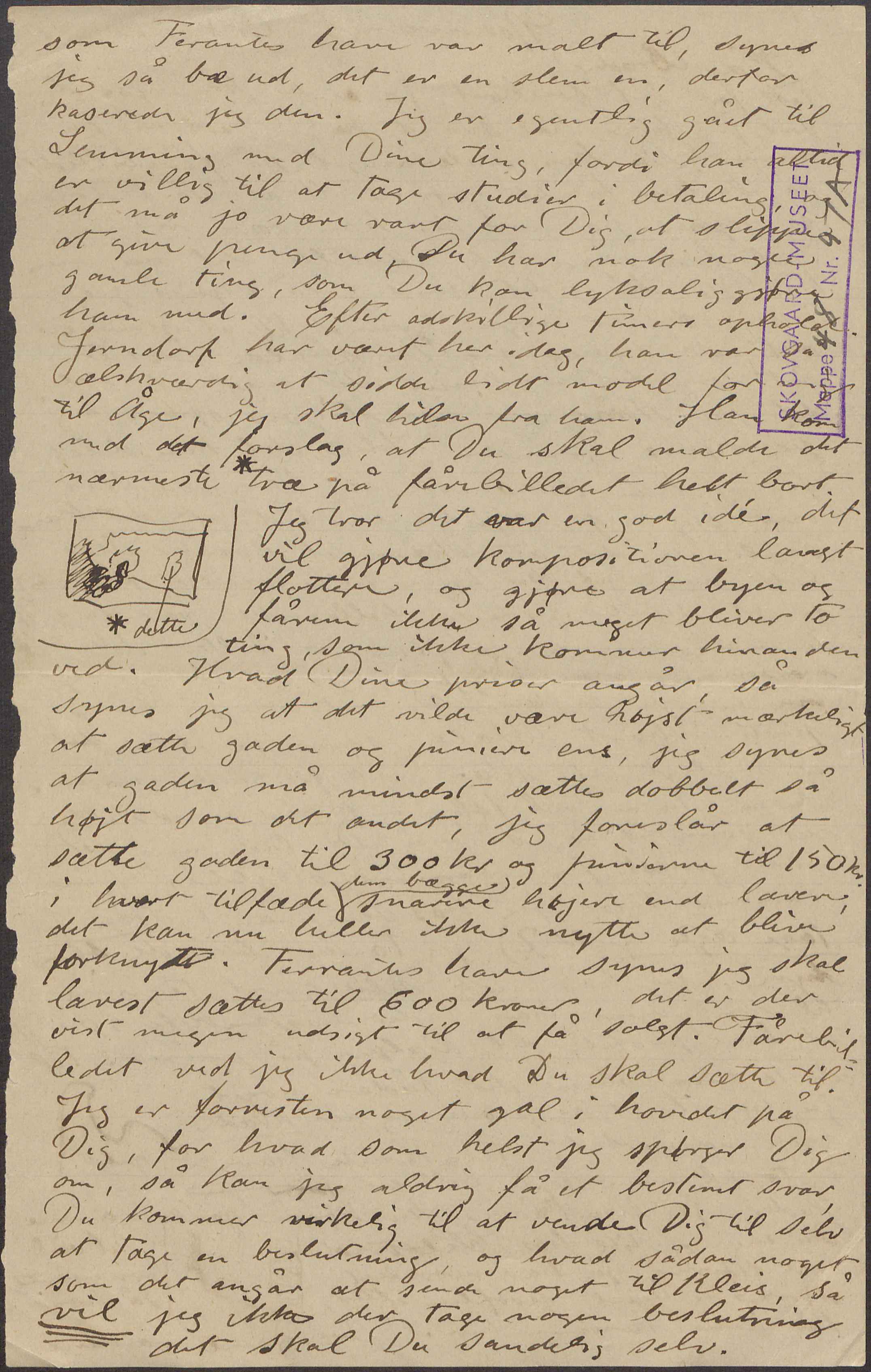 Jeg tror det var en god idé, det vil gjøre kompositionen langt flottere, og gjøre at byen og fårene ikke så meget bliver to ting, som ikke kommer hinanden ved. Hvad Dine priser angår, så synes jeg at det vilde være højst mærkeligt at sætte gaden og pinierne ens, jeg synes at gaden må mindst sættes dobbelt så højt som det andet, jeg foreslår at sætte gaden til 300 kr og pinierne til 150 kr. i hvert tilfæde |dem bægge| snarere højere end lavere, det kan nu heller ikke nytte at blive forknydt. Ferrantes have synes jeg skal lavest sættes til 600 kroner, der er der vist megen udsigt til at få solgt. Fårebilledet ved jeg ikke hvad Du skal sætte til. Jeg er for resten noget gal i hovedet på Dig, for hvad som helst jeg spørger Dig om, så kan jeg aldrig få et bestemt svar, Du kommer virkelig til at vende Dig til selv at tage en beslutning, og hvad sådan noget som det angår at sende noget til Kleis, så vil jeg ikke der tage nogen beslutning det skal Du sandelig selv.