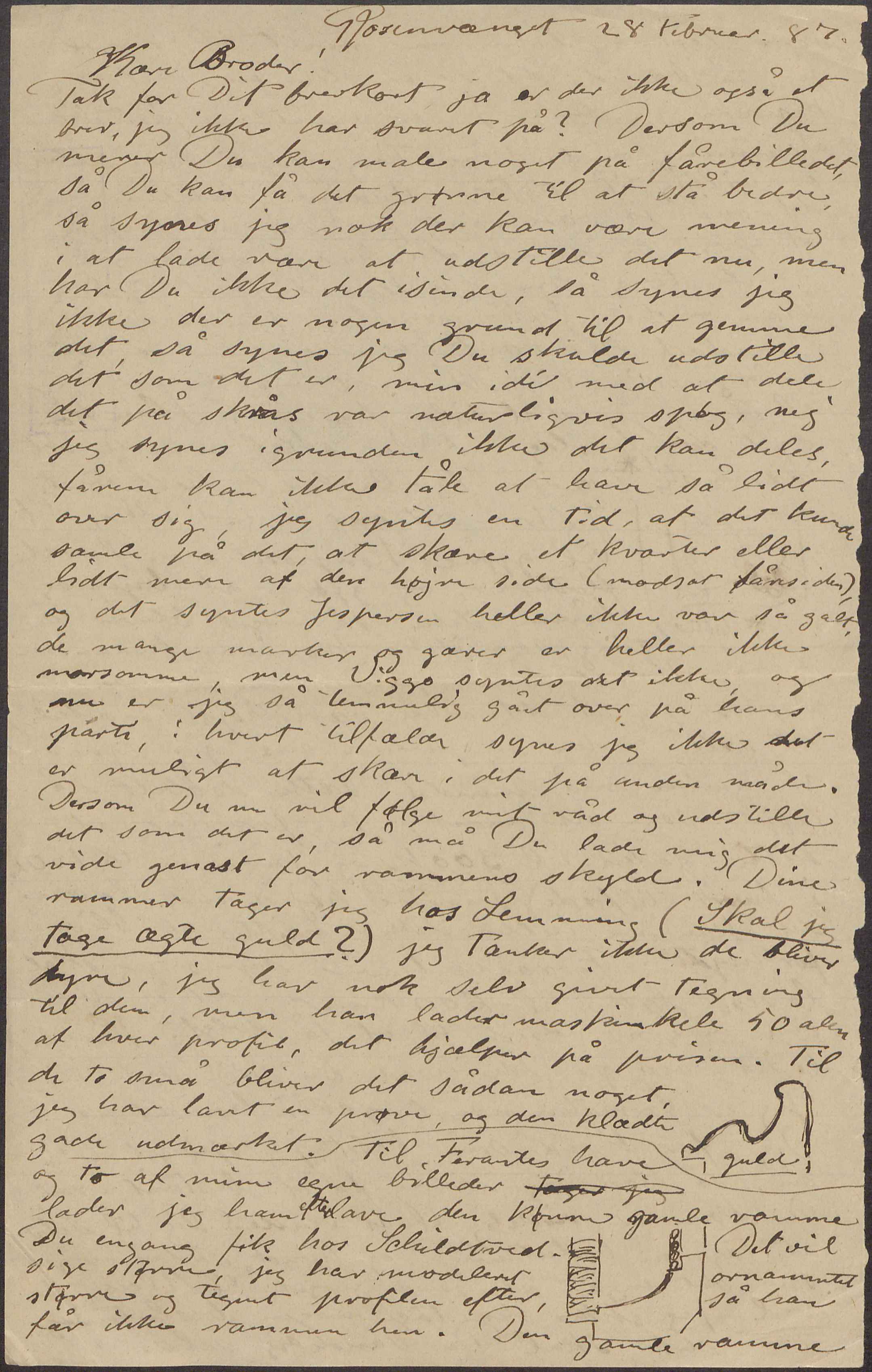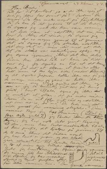 Tak for Dit brevkort ja er der ikke også et brev, jeg ikke har svaret på? Dersom Du mener Du kan male noget på fårebilledet, så Du kan få det grønne til at stå bedre, så synes jeg nok der kan være mening i at lade være at udstille det nu, men har Du ikke det isinde, så synes jeg ikke der er nogen grund til at gemme det, så synes jeg Du skulde udstille det som det er, min idé med at dele det på skrås var naturligvis spøg, nej jeg synes igrunden ikke det kan deles, fårene kan ikke tåle at have så lidt over sig, jeg syntes en tid, at det kunde samle på det, at skære et kvarter eller lidt mere af den højre side (modsat fårsiden), og det syntes Jespersen heller ikke var så galt, de mange marker og gærer er heller ikke morsomme, men Viggo syntes det ikke, og nu er jeg så temmelig gået over på hans parti, i hvert tilfælde synes jeg ikke det er muligt at skære i det på anden måde. Dersom Du nu vil følge mit råd og udstille det som det er, så må Du lade mig det vide genast for rammens skyld. Dine rammer tager jeg hos Lemming (Skal jeg tage ægte guld?) jeg tænker ikke de bliver dyre, jeg har nok selv givet tegning til dem, men han lader maskindele 50 alen af hver profil, det hjælper på prisen. Til de to små bliver det sådan noget, jeg har lavet en prøve, og den klædte ganske udmærket.