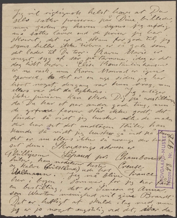Jeg vil rigtignok helst have at Du selv sætter priserne på Dine billeder, men gaden og haven synes jeg nødig må sættes lavere end de priser jeg har skrevet, det er de skam for gode til, jeg synes heller ikke tiderne er så gale som det lader til Du tror. Karen Marie er meget syg af sår på tarmene, i dag er det dog lidt bedre. Elise Konstantin Hansen er nu rask, men Karen Monrad er igen opereret, det er en uge siden jeg har hørt noget, dengang var hun svag, men ellers var det lykkedes.