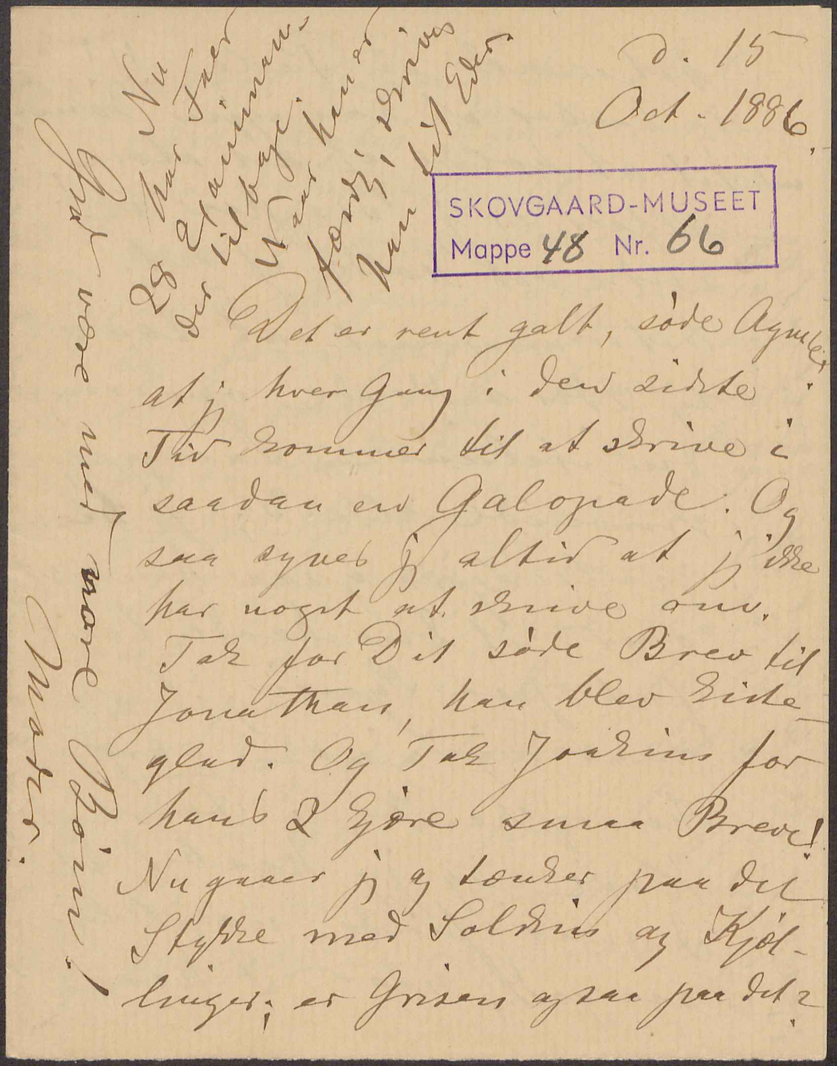 Det er rent galt, søde Agnete, at jeg hver Gang i den sidste Tid kommer til at skrive i saadan en Galopade. Og saa synes jeg altid at jeg ikke har noget at skrive om. Tak for Dit søde Brev til Jonathan, han blev kisteglad. Og Tak Joakim for hans 2 kjære smaa Breve! Nu gaaer jeg og tænker paa det Stykke med Solskin og [?]; er Grisen ogsaa paa det?