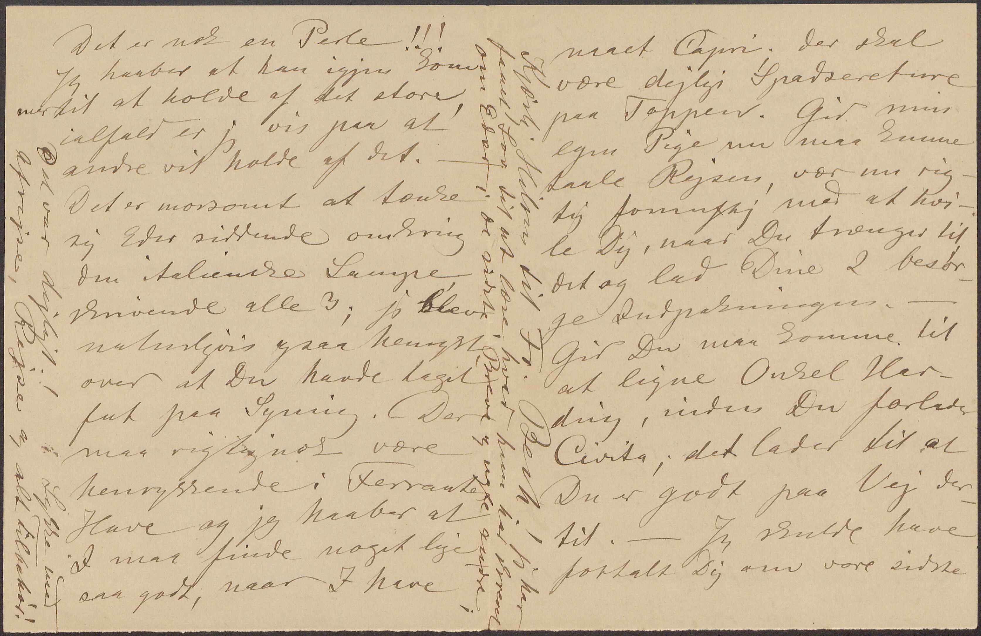 Det er nok en Perle!!! Jeg haaber at han igjen kommer til at holde af det store, ialfald er jeg vis paa at andre vil holde af det. – Det er morsomt at tænke sig Eder siddende omkring den italienske Lampe, skrivende alle 3; jeg blev naturligvis ogsaa henrykt over at Du havde taget fat paa Syning. Der maa rigtignok være henrykkende i Ferrantes Have og jeg haaber at I maa finde noget lige saa godt, naar I have