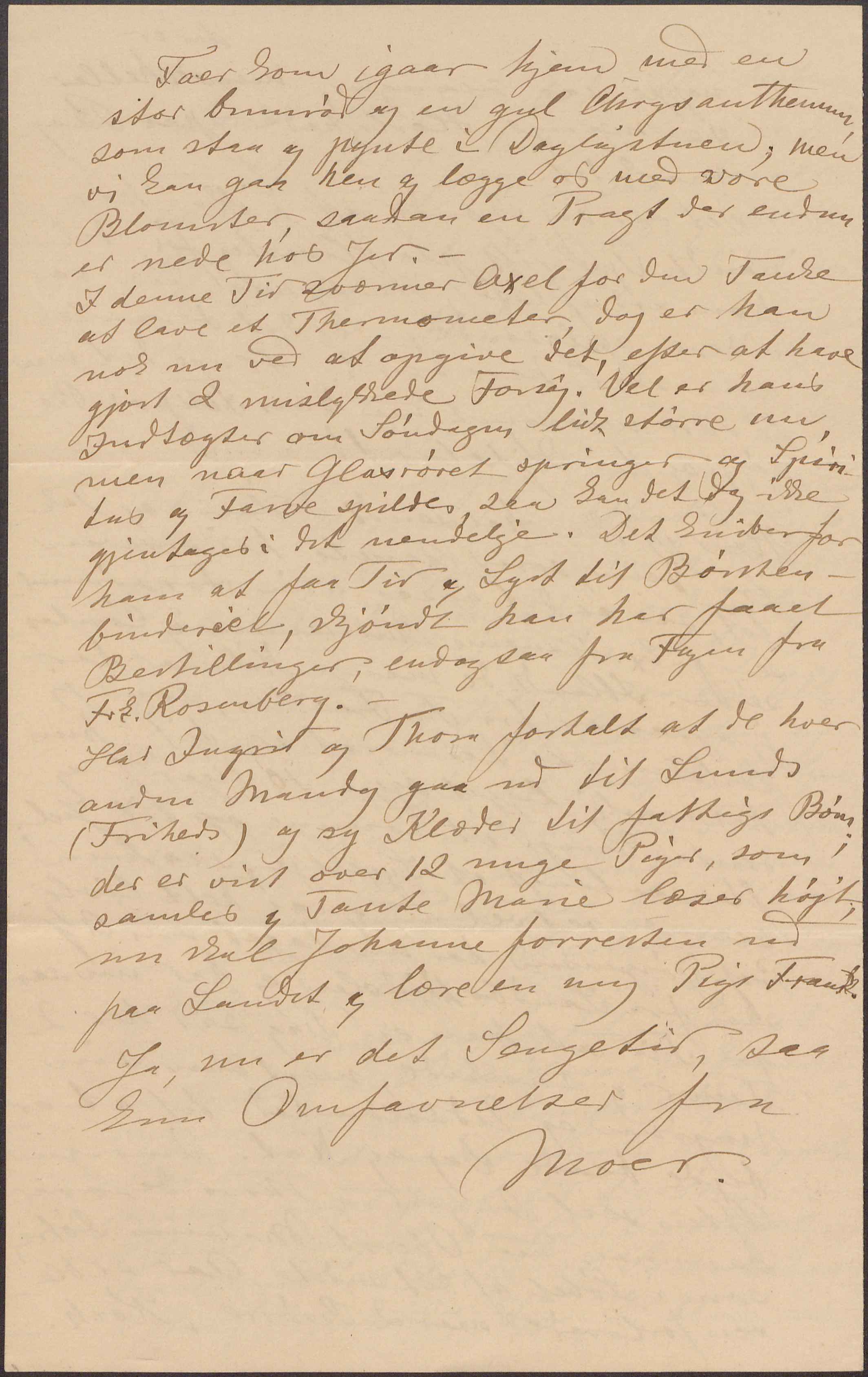 Hvordan mon det dog gaaer Eder! Ja, vi ved jo, hvem der leder og styrer! Jeg vilde saa inderlig gjerne sige et styrkende Ord, men jeg gjør det saa daarligt; jeg havde forleden skreven et langt Brev, som jeg maatte kassere. Der kan |dog| saa let blive en Tid, da I ønsker at faa et Ord fra os, hvordan det saa er, derfor tager jeg nu fat. – Fru Maribo var her i Aftes og Nils baade i Aftes og i Morges. Jeg har egentlig ventet Din Faster hele Dagen efter hvad Fru M. sagde. Jeg havde tænkt mig at Du havde skreven derom til Din Onkel og Fr. Bech og de andre af Dine nærmeste, men nu har Du maaske gjort det. Vi alle tilsammen omfatte Eder med vore Tanker og Bønner, ligesom i Sommer. – Havde jeg dog