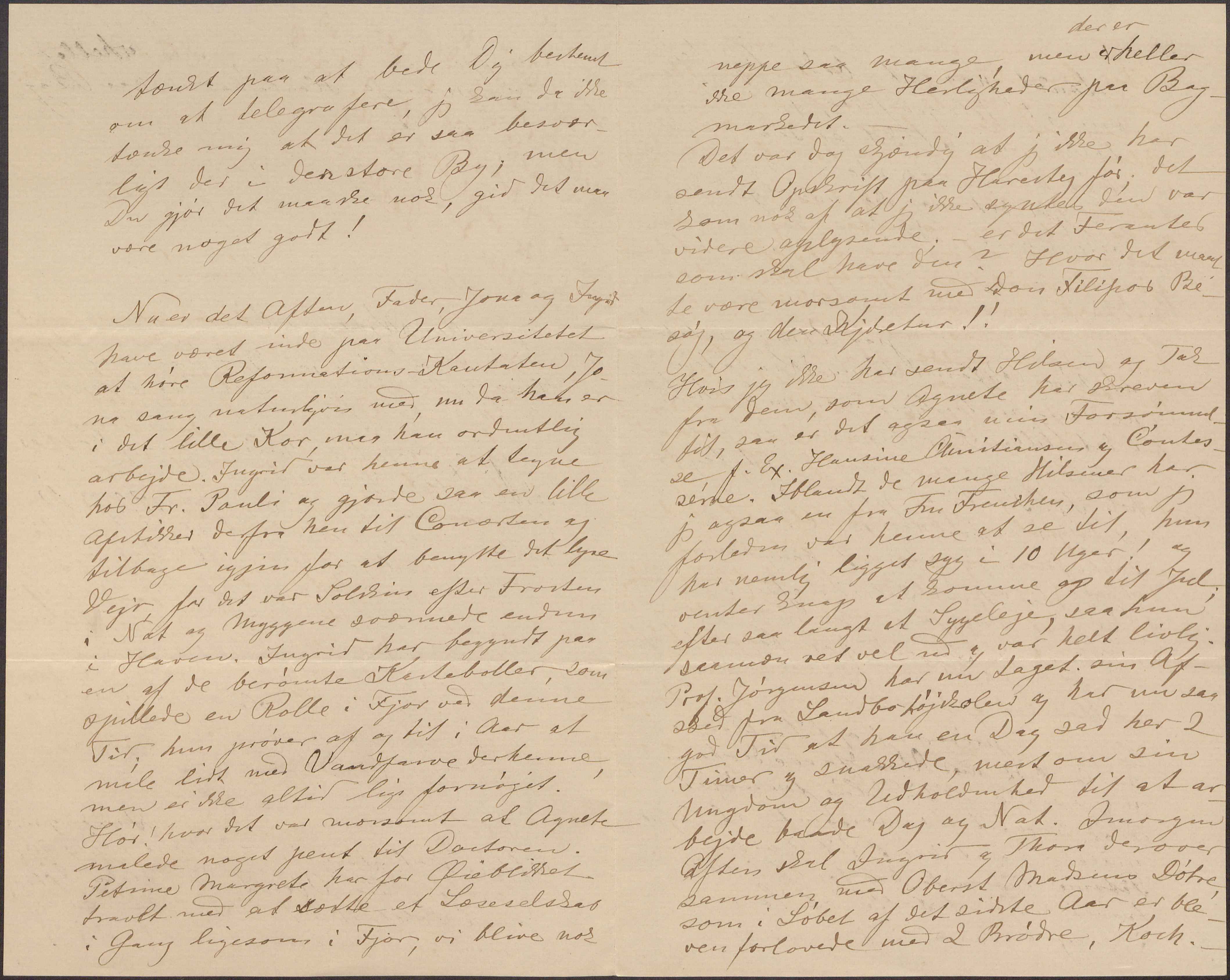 Hvis jeg ikke har sendt Hilsen og Tak fra dem, som Agnete har skreven til, saa er det ogsaa min Forsømmelse, f. Ex. Hansine Christiansen og Contesserne. Iblandt de mange Hilsener har jeg ogsaa en fra Fru Freuchen, som jeg forleden var henne at se til, hun har nemlig ligget syg i 10 Uger! og venter knap at komme op til Jul; efter saa langt et Sygeleje, saa hun saamæn ret vel ud og var helt livlig. Prof. Jørgensen har nu taget sin Afsked fra Landbohøjskolen og har nu saa god Tid at han en Dag sad her 2 Timer og snakkede, mest om sin Ungdom og Udholdenhed til at arbejde baade Dag og Nat. I morgen Aften skal Ingrid og Thora derover sammen med Oberst Madsens Døtre, som i Løbet af det sidste Aar er bleven forlovede med 2 Brødre, Koch. -
