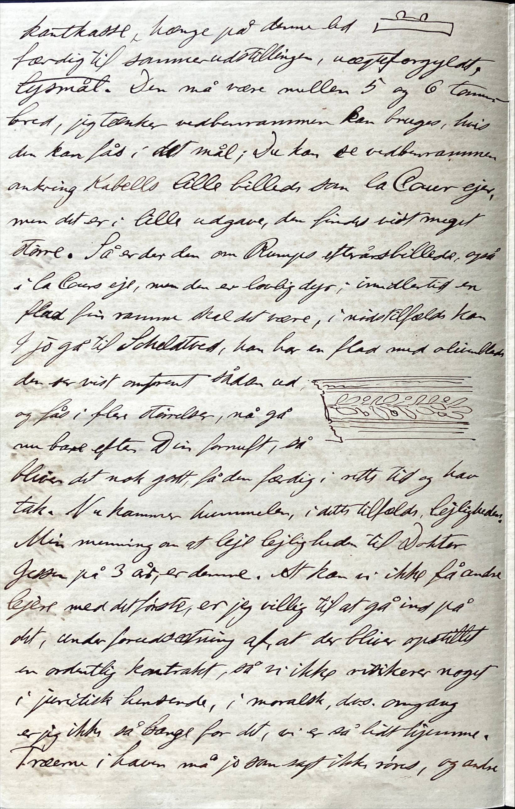 kantkasse, hænge på denne led færdig til sommerudstillingen, uægteforgyldt, Den må være mellem 5 og 6 tommer bred, jeg tænker vedbenrammen kan bruges, hvis den kan fås i det mål; Du kan se vedbenrammen omkring Kabells lille billede som la Cour ejer, men det er i lille udgive, den findes vist meget større. Så er der den om Rumps efterårsbillede, også i la Cours eje, men den er lovlig dyr; imidlertid en flad fin ramme skal det være, i nødstilfælde kan I jo gå til Scheldtved, han har en flad med olivenblade, den ser vist omtrent sådan ud og fås i flere størrelser, nå gå nu bare efter Din fornuft, så bliver det nok godt, få den færdig i rette tid og hav tak. Nu kommer hummelen, i dette tilfælde, lejligheden. Men min mening om at leje lejligheden til Doktor Jessen på 3 år, er denne. At kan vi ikke få andre lejere med det første, er jeg villig til at gå ind på det, under forudsætning af, at der bliver opstillet en ordentlig kontrakt, så vi ikke risikerer noget i juridisk hensende, i moralsk d.v.s. omgang er jeg ikke så bange for det, vi er så lidt hjemme. Træerne i haven må jo som sagt ikke røres, og andre
