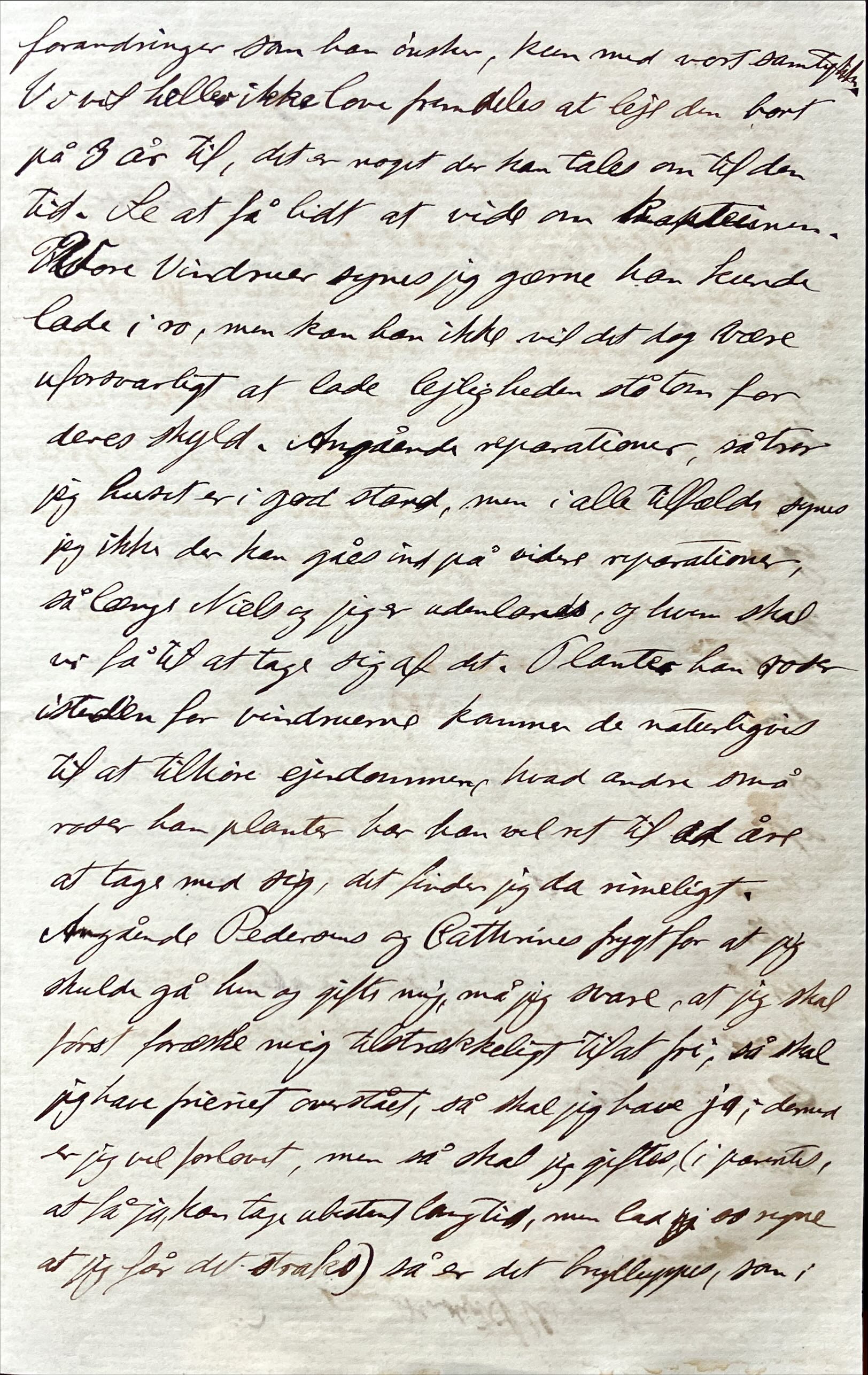 forandringer som han ønsker, kun med vort samtykke. Vi vil heller ikke love fremdeles at leje den bort på 3 år til, det er noget der kan tales om til den tid. Se at få lidt at vide om kapteinen. Vore vindruer synes jeg gærne han kunde lade i ro, men kan han ikke vil det dog være uforsvarligt at lade lejligheden stå tom for deres skyld. Angående reparationer, så tror jeg huset er i god stand, men i alle tilfælde synes jeg ikke, der kan gåes ind på videre reparationer så længe Niels og jeg er udenlands, og hvem skal vi få til at tage sig af det. Planter han roser isteden for vindruerne kommer