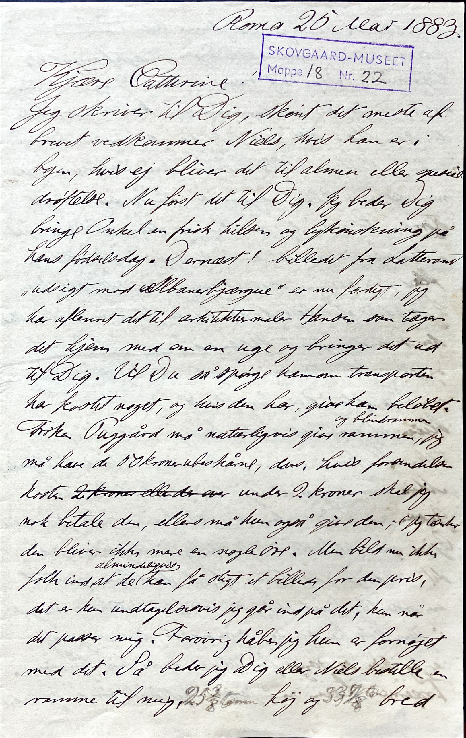 Jeg skriver til Dig, skønt det meste af brevet vedkommer Niels, hvis han er i byen, hvis ej bliver det til almen eller speciel drøftelse. Nu først det til dig. Jeg beder Dig bringe Onkel en frisk hilsen og lykønskning på hans fødselsdag. Dernæst! billedet fra Latterand ”udsigt mod Albanerbjærgene” er nu færdigt, jeg har afleveret det til arkitekturemaler Hansen som tager det hjem med om en uge og bringer det ud til Dig. Vil Du så spørge ham om transporten har kostet noget, og hvis den har, give ham beløbet. Frøken Puggård må naturligvis give rammen og blindrammen, jeg må have de 50 kroner ubeskårne, d.v.s. hvis forsendelsen koster under 2 kroner skal jeg nok betale den, ellers må hun også give den; jeg tænker den bliver ikke mere en nogle øre. Men bild nu ikke folk ind, at de almindeligvis kan få sligt et billede for den pris, det er kun undtagelsesvis jeg går ind på det, kun når det passer mig. Forøvrig håber jeg hun er fornøjet med det. Så beder jeg Dig eller Niels bestille en ramme til mig, 25 3/8 tomme høj og 33 1/8 tomme bred