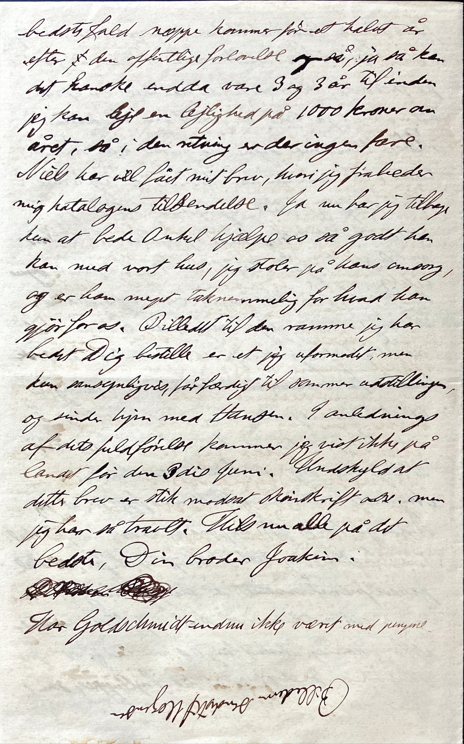 bedste fald næppe kommer før et halvt år efter den offentlige forlovelse og så, ja så kan det kanske endda vare 3 og 3 år til inden jeg kan leje en lejlighed på 1000 kroner om året, så i den retning er der ingen fare. Niels har vel fået mit brev, hvori jeg frabeder mig katalogens tilsendelse. Ja nu har jeg tilbage kun at bede Onkel hjælpe os så godt han kan med vort hus, jeg stoler på hans omsorg, og er ham meget taknemmelig for hvad han gjør for os. Billedet til den ramme jeg har bedt Dig bestille er et jeg uformodet, men kun sansynligvis, får færdigt til sommer udstillingen, og sender hjem med Hansen. I anledning af dets fuldførelse kommer jeg vist ikke på landet før 3die Juni. Undskyld at det brev er stik modsat skønskrift o.s.v. men jeg har så travlt. Hils nu alle på det bedste Din broder Joakim.