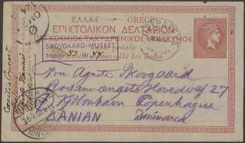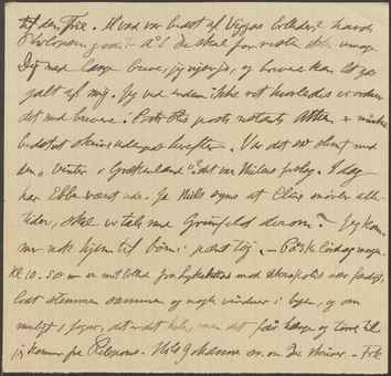 til den Frie. Hvad er bedst af Viggos billeder? Havde Philipsen gode? Å du skal for resten ikke umage dig med lange breve, jeg rejser jo, og breve kan let gå galt af mig. Jeg ved endnu ikke ret hvorledes vi ordner det med brevene. Porte Ris poste restante Athen er måske bedst at skrive udenpå herefter. Var det så slemt, med den ”vinter i Grækenland”? Det er Niels forslag. I dag har Ebbe været ude. Ja Niels synes at Eline snøvler alle tider, skal vi tale med Grundfeld derom? Jeg kommer nok hjem til børn i pænt tøj. – Påske lørdag kl. 10 så nu er mit billede fra Lykebettes med Akropolis nær færdigt, lidt stemmen sammen og nogle vinduer i byen, og om muligt 1 [?] det er det hele, men det får hænge og tørre til jeg kommer fra Pelepones. Hils Johanne osv om de skriver – Frk.