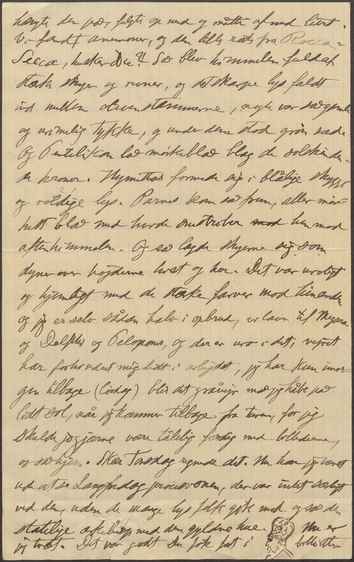Vi fandt anemoner, og den lille fra Rocca Seccia, husker du? Så blev himlen fuld af stærke skyer, og det skarpe lys faldt ind imellem olivenstammerne, nogle var så gamle og rimelig tykke, og under dem stod grøn sæd, og pentelikon lå mørkeblå bleg de solskinnende kroner. Hymittas formede sig i blålige skygger og rødlige lys. Parnas kom så frem allermørkestblå med hvide striber hen mod aftenhimlen. Og så lagde skyerne sig som dyner over højderne hist og her. Det var utroligt og hjemligt med de stærke farver mod hinanden, og jeg er selv sådan halvt i opbrud, er lave til Myrna og Delphi og Pelopones, og der er uro i det, vejret har forhindret mig lidt i arbejdet, jeg har kun i morgen tilbage (lørdag) bliver det gråvejr må jeg håbe på lidt sol, når jeg kommer tilbage fra turen, for jeg skulde jo gerne være tålelig færdig med billederne og så hjem. Skær Torsdag regnede det. Nu har jeg været ude at se Langfredag prossionen, der var intet særligt ved den, uden at de mange lys folk gik med, og så den statelige ærkebiskop med den gyldne hue. Nu er jeg træt. Det var godt du fik fat i billetter