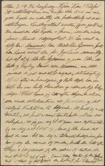Athen 3-4-96 Langfredag. Kjære Kone. Tak for det udstillingsbrev, men hvorfor ikke et ord om min gode hyrde ser ordentlig eller forskrækkelig ud på udstillingen. Svendborgaltret venter jeg ser galt ud. Men hvordan står hyrden i farven, især den røde farve. Hermed adgangskort. Vi har været en dejlig tur i Marousi, kun Niels blev hjemme fordi han havde været der før. Jeg havde samvittighed af at jeg ikke blev hjemme og passe Ebbe, så Niels og Ingeborg havde været sammen, men dels pressede de på med at få mig ud, dels trængte jeg til det efter hovedpine, og Niels sagde, han var træt. Der var herlig olivenskov og vidunderlig belysning. Først tegnede jeg og lidt efter ældgamle oliven som at vende sølvkanterne ud for vinden, og det hvidgrå Pentelikon lå bagved. Så fandt jeg en død tarantel, så fandt vi mange tarantelhuller, det var så indbydende så jeg gav mig til at grave mere systematisk.