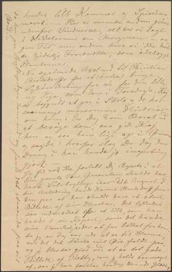 Tak for det søde fra Eder begge om den gule Silkekjole, Dit Mesterstykke, Agnete! og Joakims Madonna, som den klæder saa godt. Jeg kunde ogsaa nok lide at se hende med den i Glands; vilde ogsaa med stor Fryd se hende i den uden Glands. – Gid Solen maa have skinnet for Eder paa Rejsen og den maa være gaaet rigtig godt og lykkeligt! –|