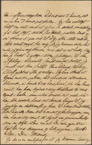 har jeg før haft drengene, men ikke kunnet lade mine ting flyde, nu siden vi har fået barnestue, har jeg drengene og kan dog lade tingene flyde. Å, lille Madam, hvor jeg glæder mig til at se Jer. Bare der gik direkte damper fra Helsingborg på den tid, men det ved jeg ikke, om der gjør. Synes Du ikke jeg er ganske flink, at jeg tager to dages jagt til sidst istedenfor at rejse lige hjem. Jeg synes nu, at jeg har holdt og holder ørene godt stive her oppe så længe. For øjeblikket står de andre og undersøger og lugter til en ny tobak Bergmann har købt til Jensen, den hedder ”Dalkullen”. De synes ikke den lugter godt, og det ryger af den, og det er ikke spor af blade, bare stilke der er haggede, og det er dog den dyreste fra Tvååker. Niels mener, det er en mild vare. I dag bad jeg Laurell, at om han engang kom til Kjøbenhavn, så måtte han dog endelig ikke gå vor dør forbi. Han takkede meget og sagde, han skulde nok komme.