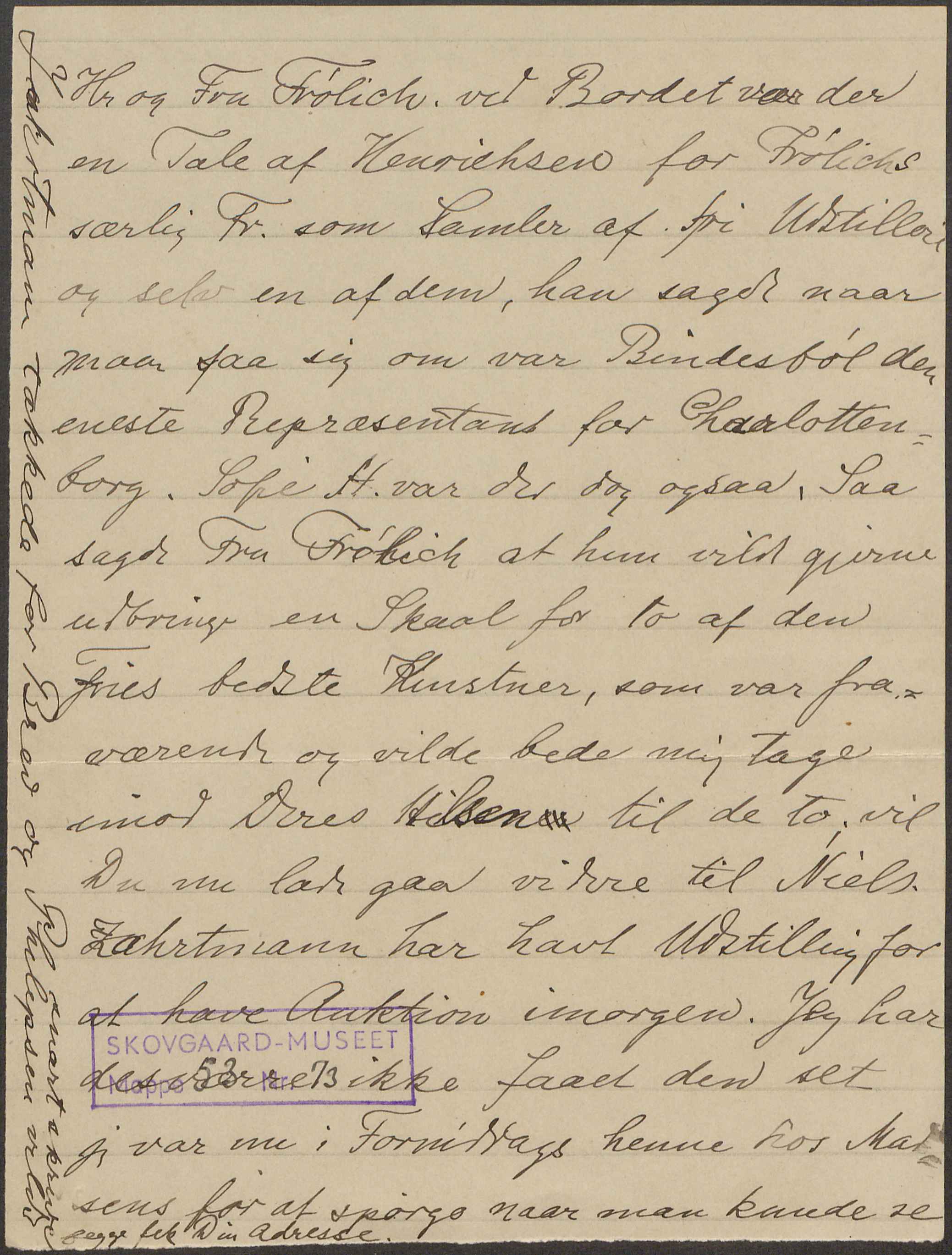 Zartmann har haft udstilling for at have Auktion i morgen. Jeg har desværre ikke faaet den set, jeg var i Formiddags henne hos Madsens for at spørge naar man kunde se