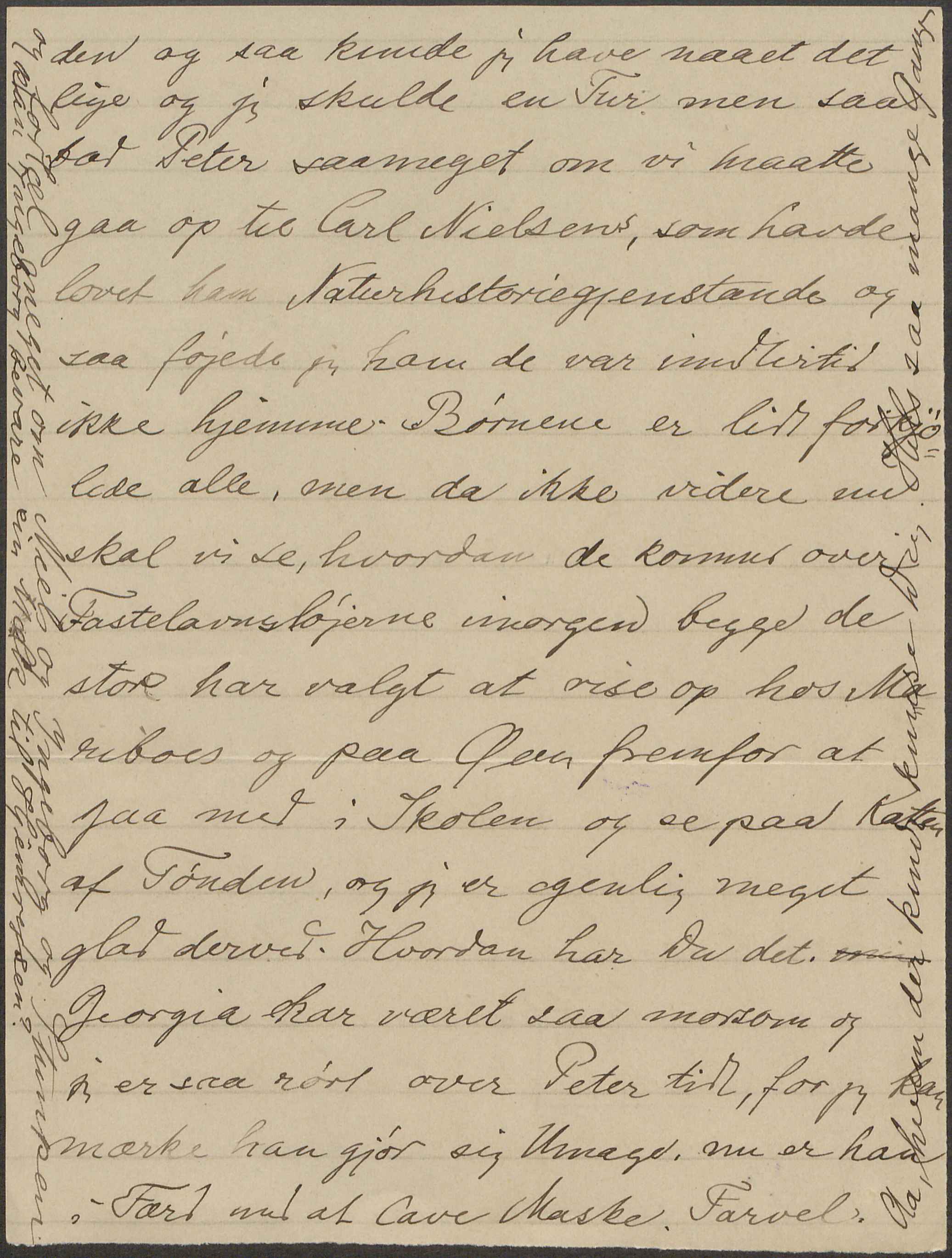 den, og saa kunde jeg have naaet det lige, og jeg skulde en Tur, men saa bad Peter saa meget om vi maatte gaa op til Carl Nielsens, som havde lovet ham Naturhistoriegenstande, og saa føjede jeg ham, de var imidlertid ikke hjemme. Børnene er lidt forkølede alle, men da ikke videre, nu skal vi se, hvordan de kommer over Fastelavnsløjerne i Morgen, begge de store har valgt at rise op hos Mariboes og paa Øen, frem for at gaa med i Skolen og se paa Katten af Tønden, og jeg er egentlig meget glad derved. Hvordan har du det, Georgia har været saa morsom og jeg er saa rørt over Peter tidt, for jeg kan mærke han gør sig Umage, nu er han i Færd med at lave Maske. Farvel.