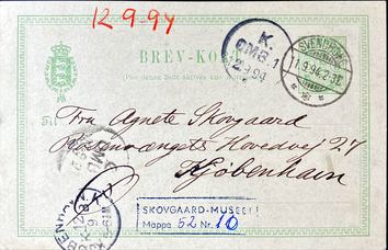 Kjære kone! I aften skal jeg fortælle, foreløbig dette. Rejs helst på fredag, nødig senere* til Johanne og tag begge børnene med, ved første lejlighed kan Niels bringes til Christiansdal, som nok kun er en fjerdingvej borte. Skulde Du så være utilfreds med et eller andet, tag så til Gudbjerg, hvortil Du er indbuden (mundtlig til mig) der kan de bestemt huse begge børnene og Du er i nærheden af drengene og behøver ikke at tage hjem fordi jeg rejser. For resten tager altret nok nogen tid. På søndag tager jeg til Johanne, og kan da mundtlig aftale alt fra Fredag til søndag, må du bestemt kunde holde det ud for fugtighed. Jeg skriver nu til Johanne at hun kan vente dig på Fredag og så rejse på søndag, lykkelig rejse. Alt vel, i går så jeg Johanne og mange andre ved højskolemøde her (efterdønninger fra Askov). Svendborg 11 setl 1894. Tak for Uhrsnoren. Mange hilsener Din Mand