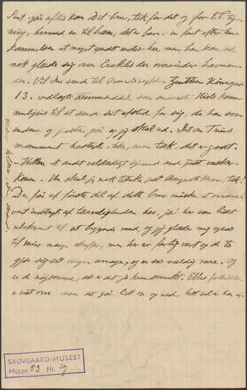 Du får af første del af dette brev måske et overdrevent indtryk af tarveligheder her, ja, her var lidt ubekvemt til at begynde med, og jeg glæder mig også til mine mange skuffer, men her er farlig rart og de to gjør sig også megen umage, og er vældig rare. Og er de nøjsomme, så er det jo kun smukt. Ebbes forkølelse er vist ovre med det går lidt op og ned, helt vel er han ej.
