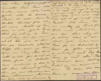 Lige nu modtog jeg Brev fra Hilde med Meddelelse om den store Sorg, at jeg aldrig skal se vor elskede, gode Onkel mere. Hvor jer er bedrøvet, og hvor jeg føler varmt og inderligt med Dig, kære Sam, og med alle Slægt og Venner, som holdt af Onkel og nu sørger over ham. Du, som var om ham, og som var saa