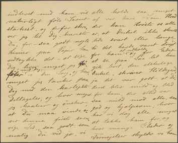 indlevet med ham, vil naturligt føle savnet stærkest, og derfor skriver jeg til Dig, kæreste du, for – saa godt nogle Linier paa Papir kan udtrykke det – at sige Dig, hvor meget jeg føler med Dig i Din Sorg, og hvor meget jeg tænker paa Dig med den kærligste Deltagelse, og hvor meget jeg haaber og ønsker, at Du maa vinde over denne første savnrige Tid, saa godt som mulig. Du ved jo, vi