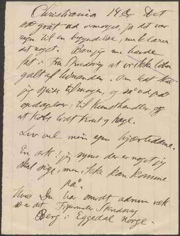 og dejlig udsigt, og Lie og Werenskjold var der. Vi fik god mad øl, rødvin og en extra sjerry, som S. havde sparet i lang tid til min ankomst, den var så god, så jeg slet ikke fik tømmermænd, og vi lo og var glade. Der er farlig fint, ellegant og hyggeligt og rart på Fleskum, måske nogle af meublerne osv. er lidt mere schik end egentlig fint kunst. Den 14de god Morgen madam. Nå i går var jeg altså inde i Staden fra 9 ½ til 5, fik masach 2 gange og fordrev ellers tiden, som jeg kunde. S. har skaffet mig et værelse hos en bekendt, hvor jeg kan gå op og sidde, når jeg vil, han er mærkelig nok assurandør for ulykkestilfælde, så Skredvig beklagede, at jeg ikke i tide havde ladet mit ben assurere, men Hansen (assurandøren) sagde for resten, at mit var ikke noget ulykkestilfælde, da det ikke var sket ved fald eller stød. Det kan der nu disputeres om, fra mit synspunkt må det i altfald regnes for et meget