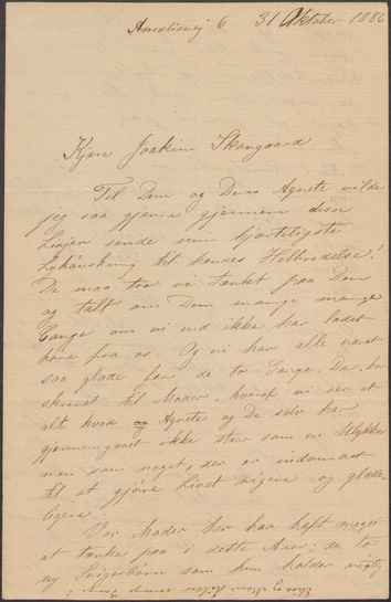 Kjære Joakim Skovgaard! Skjøndt De ikke har hørt det af mig selv, har De vel ikke tvivlet om, at jeg var i de forreste Rækker iblandt Deres gamle Venner til at glæde mig med Dem og takke Vor Herre for at De og Deres kjære Hustru |nu| med nye Kræfter kunde tage fat igjen og af fuldt Hjerte fryde Dem over al den Velsignelse Gud har givet Dem i hinanden. Medens De glæder Dem over Dejligheden derned, glemmer De dog vist ikke, at ogsaa her er yndigt at være og godt at sætte Bo.