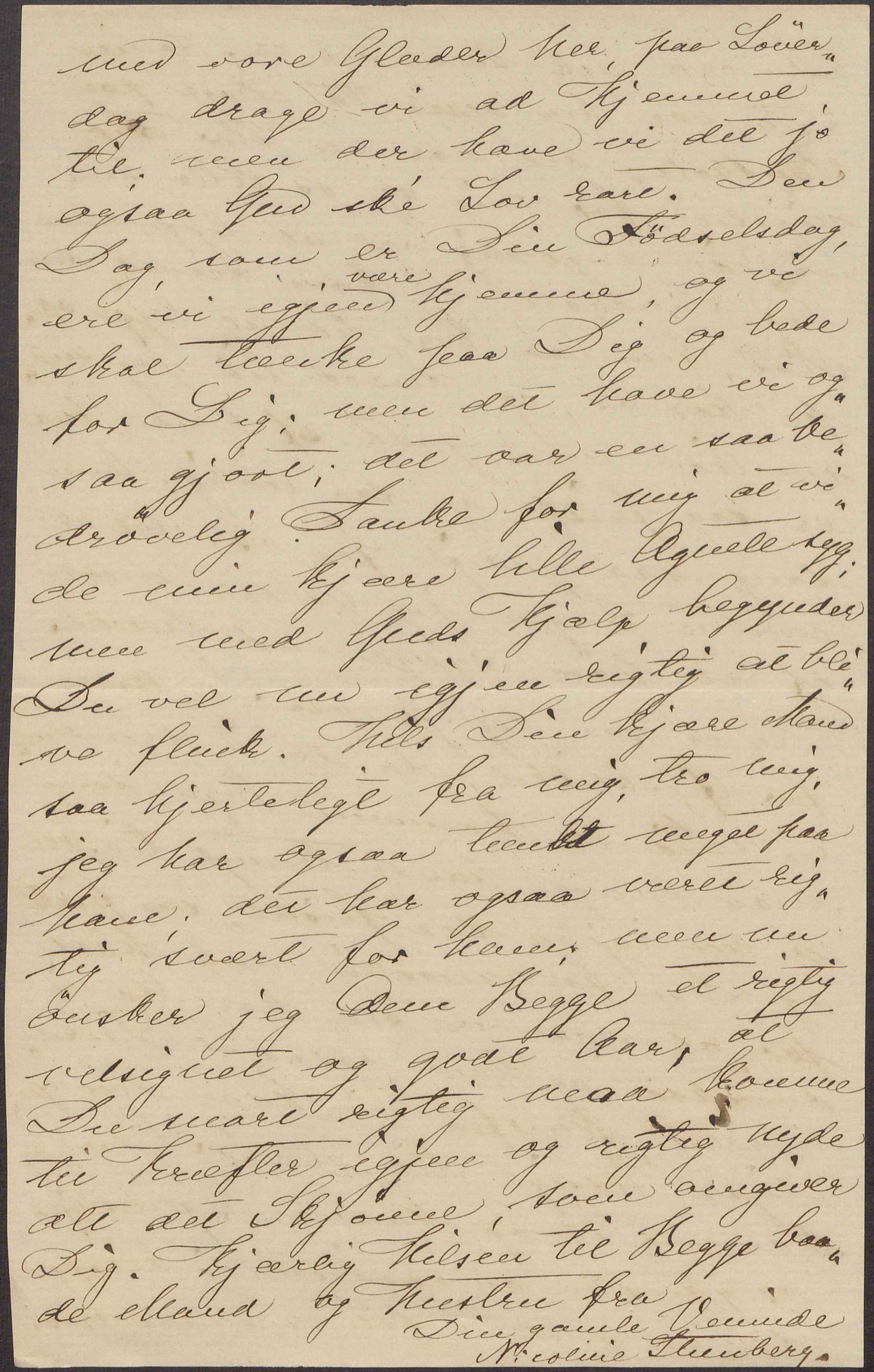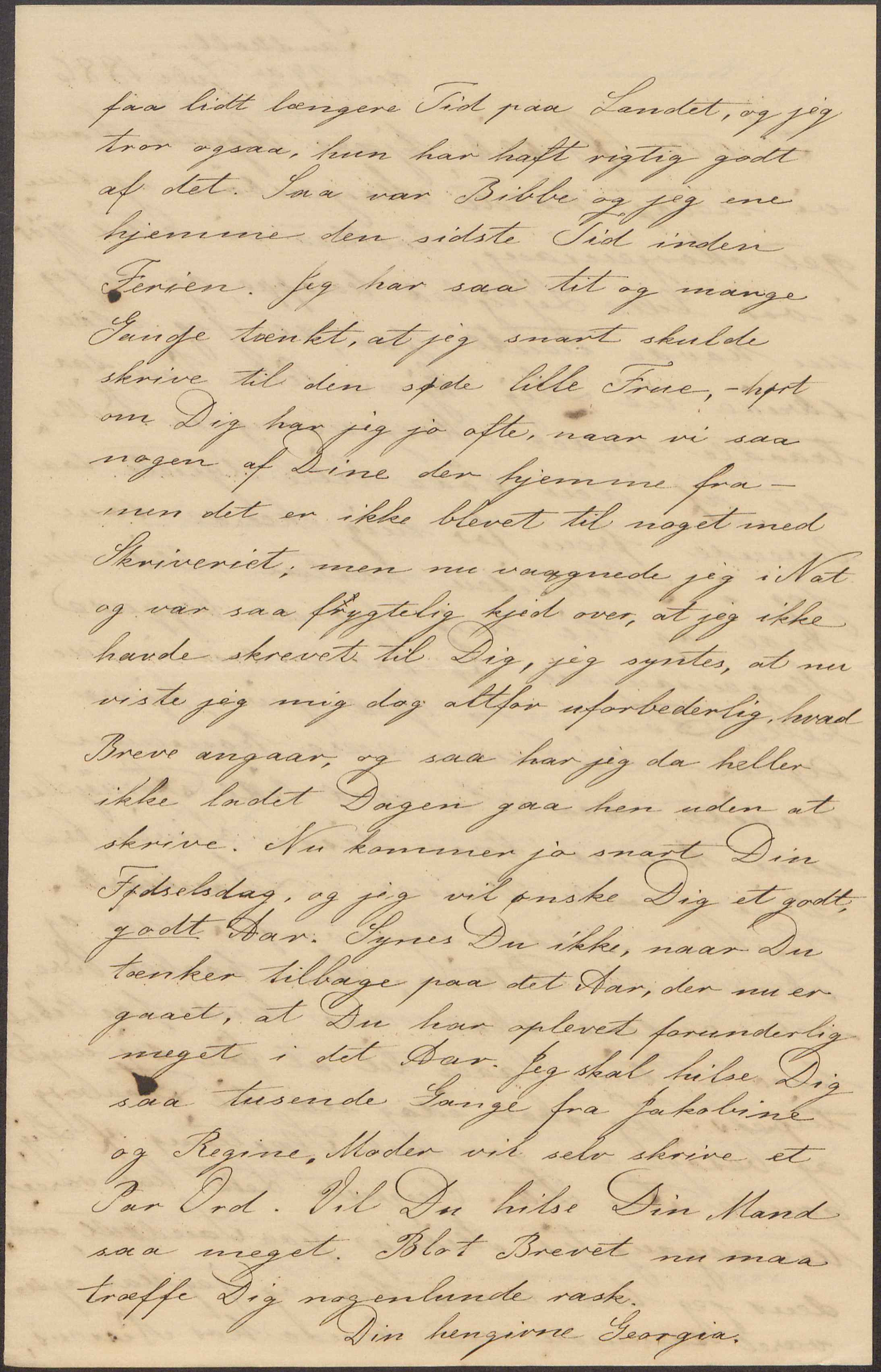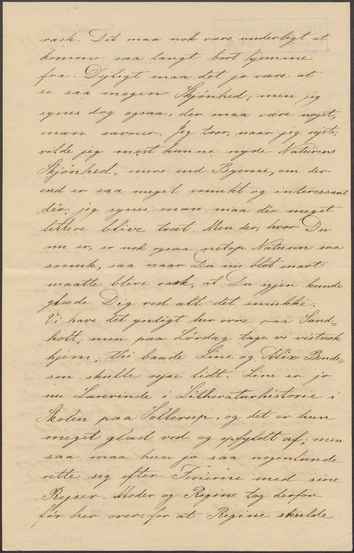 faa lidt længere Tid paa Landet, og jeg tror ogsaa, hun har haft rigtig godt af det. Saa var Bibbe og jeg ene hjemme den sidste Tid inden Ferien. Jeg har saa tit og mange Gange tænkt, at jeg snart skulde skrive til den søde lille Frue, - hørt om Dig har jeg jo ofte, naar vi saa nogen af Dine der hjemme fra – men det er ikke blevet til noget med Skriveriet; men nu vaagnede jeg i Nat og var saa frygtelig kjed over, at jeg ikke havde skrevet til Dig, jeg syntes at nu viste jeg mig dog altfor uforbederlig, hvad Breve angaar, og saa har jeg da heller ikke ladet Dagen gaa hen uden at skrive. Nu kommer jo snart Din Fødselsdag, og jeg vil ønske Dig et godt, godt Aar. Synes Du ikke, naar Du tænker tilbage paa det Aar, der nu er gaaet, at Du har oplevet forunderlig meget i det Aar. Jeg skal hilse Dig saa tusende Gange fra Jakobine og Regine. Moder vil selv skrive et Par Ord. Vil Du hilse Din Mand saa meget. Blot Brevet nu maa træffe Dig nogenlunde rask.