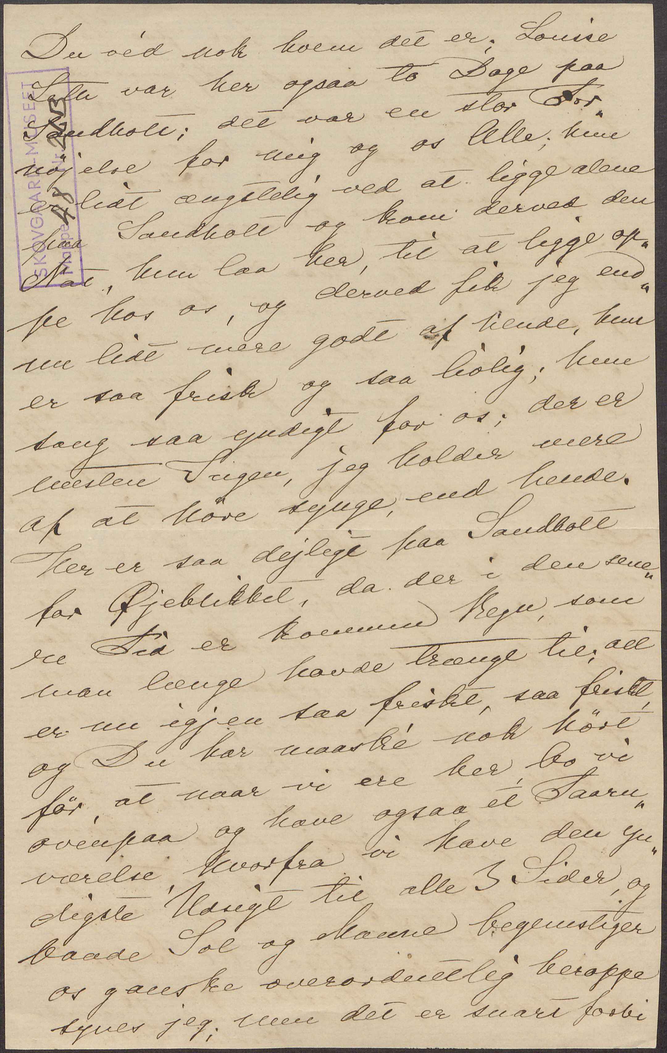 Du véd nok hvem det er; Louise Leth var her ogsaa to Dage paa Sandholt; det var en stor Fornøjelse for mig og os Alle; hun er lidt ængstelig ved at ligge alene paa Sandholt og kom derved den Nat, hun laa her, til at ligge oppe hos os, og derved fik jeg endnu lidt mere godt af hende, hun er saa frisk og saa livlig; hun sang saa yndigt for os; der er næsten Ingen, jeg holder mere af at høre synge end hende. Her er saa dejligt paa Sandholt for Øjeblikket, da der i den senere Tid er kommen Regn, som man længe havde trængt til; alt er nu igjen saa friskt, saa friskt og Du har maaské nok hørt før, at naar vi ere her, bo vi ovenpaa og have ogsaa et Taarnværelse, hvorfra vi have den yndigste Udsigt til alle 3 Sider, og baade Sol og Maane begunstiger os ganske overordentlig heroppe synes jeg; men det er snart forbi