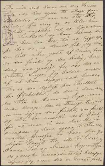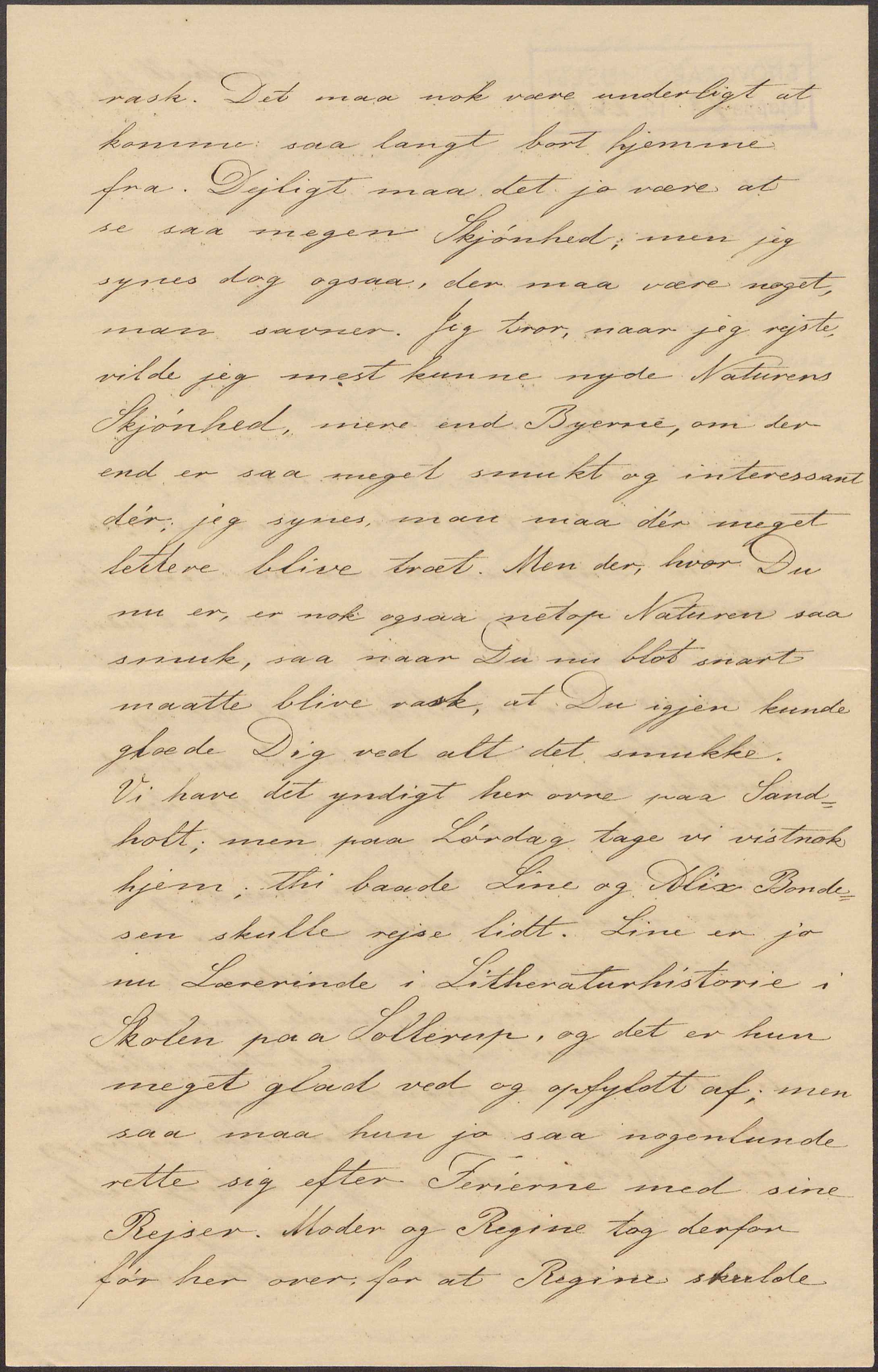 rask. Det maa nok være underligt at komme saa langt bort hjemme fra. Dejligt maa det jo være at se saa megen Skjønhed; men jeg synes dog ogsaa, der maa være noget, man savner. Jeg tror, naar jeg rejste, vilde jeg mest kunne nyde Naturens Skjønhed, mere end Byerne, om der end er saa meget smukt og interessant dér, jeg synes, man maa dér meget lettere blive træt. Men der, hvor Du nu er, er nok ogsaa netop Naturen saa smuk, saa naar Du nu blot snart maatte blive rask, at Du igjen kunde glæde Dig ved alt det smukke. Vi have det yndigt her ovre paa Sandholt; men paa Lørdag tage vi vistnok hjem; thi baade Line og Alix Bondesen skulle rejse lidt. Line er jo nu Lærerinde i Litheraturhistorie i Skolen paa Sotterup, og det er hun meget glad ved og opfyldt af; men saa maa hun jo saa nogenlunde rette sig efter Ferierne med sine Rejser. Moder og Regine tog derfor før her over for at Regine skulde