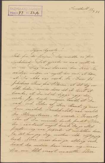 I dette Øjeblik, kjære Agnete have vi netop holdt Morgenbøn og sunget Morgensang, hvilket vi altid gjør i vor lille Lejlighed heroppe, og da jeg nu havde tænkt paa, at jeg vilde skrive til Dig, kjære lille Ven, saa traadte under Morgensangen Billedet af den søde lille Agnete saa levende frem for mig, hende som jeg i Skoletiden næsten altid vinkede op til mig for at begynde Morgensangen og holde i den i den rette Tone; Ja Gud give, kjære Agnete, Du maa være kommen saavidt, saa Du med lidt Fornøjelse maa kunne læse disse Linier fra Dine gamle Venner i Danmark. Jacobine sidder ligeoverfor mig og skriver til Petrine; hun haaber Brevet endnu skal naa hende paa Askov, hvor Petrine lader til at føle sig meget tilfreds. Jeg skal i dag ud til Faaborg og besøge en gammel Slægtning af Dig, gamle Fru Leth; Augusta Leth har været her engang til Middag paa Sandholt medens jeg har været her, og jeg har ogsaa været sammen med hende hos Nissens,