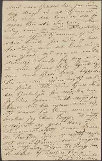 med vore glæder her, paa Løverdag drage vi ad Hjemmet til; men der have vi det jo ogsaa Gud ské Lov rart. Den Dag, som er Din Fødselsdag, ere vi igjen |være| hjemme, og vi skal tænke paa Dig og bede for Dig; men det have vi ogsaa gjort; det var en saa bedrøvelig Tanke for mig at vide min kjære lille Agnete syg; men med Guds Hjælp begynder Du vel nu igjen rigtig at blive flink. Hils Din kjære Mand saa hjerteligt fra mig, tro mig, jeg har ogsaa tænkt meget paa ham; det har ogsaa været rigtig svært for ham; men nu ønsker jeg Dem Begge et rigtig velsignet og godt Aar, at Du snart rigtig maa komme til Kræfter igjen og rigtig nyde alt det Skjønne, som omgiver Dig.