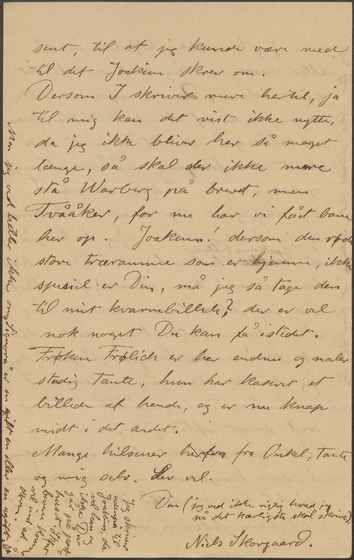godt, men ellers er det blevet meget godt. Det har glædet mig at erfare at Lytzhøft synes godt om Zartmann som lærer, han ønsker da ikke at bytte ham for K|r|øyer, og skolen er nok heller ikke, som jeg troede, en forberedelsesskole til Krøyer, men en helt selvstændig skole. Ja alt hvad jeg har skrevet har nok kun interesse for Dig og ikke for Agnete, som gærne vil høre noget, men jeg fæ har ikke kundet hitte på andet, så I må tage til takke. Hils nu A. og frk. Nanny B. på det hæftigste fra Din broder. Tante sidder model for frk. Frølich, fra frokost til kl. 6, derfor har hun ikke overkommet det lovede brev. Jeg skal hilse fra hende.