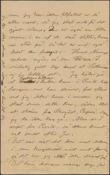 men jeg tror ikke tilfældet er så aller værst, så jeg skal nok få det gjort istand. Der er også en lille revne i en af de små stifter, hanerne slår på, så det er vist også bedst den fornyes. Hvad Nannys ophold angår, så kan du vir I virkelig godt tage imod at Cathrine og jeg betaler det. Jeg håber på at holder |Joakims billeder| holder ham i Civita lidt længere end han skriver, for ellers ved jeg ikke hvor i verden jeg skal sende dette brev, sådan blot at skrive fru Skovgård, Capri, synes jeg da ikke kan gå. Men er I rejst fra Civita, så bliver brevet vel sendt efter Jer.