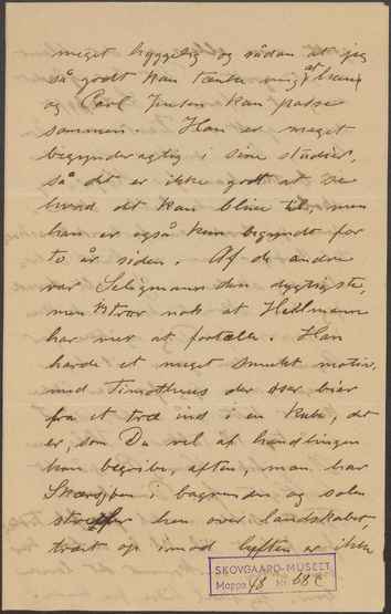 meget hyggelig og sådan at jeg så godt kan tænke mig |at| han s og Carl Jensen kan passe sammen. Han er meget begynderagtig i sine studier, så det er ikke godt at se hvad det kan blive til, men han er også kun begyndt for to år siden. Af de andre var Seligmann den dygtigste, men jeg tror nok at Heilmann har mer at fortælle. Han havde et meget smukt motiv, med Timotheus der øser bier fra et træ ind i en kube, det er, som Du vel af handlingen kan begribe, aften, man har Skærsjøen i bagrunden og solen streifer hen over landskabet, træet op imod luften er ikke
